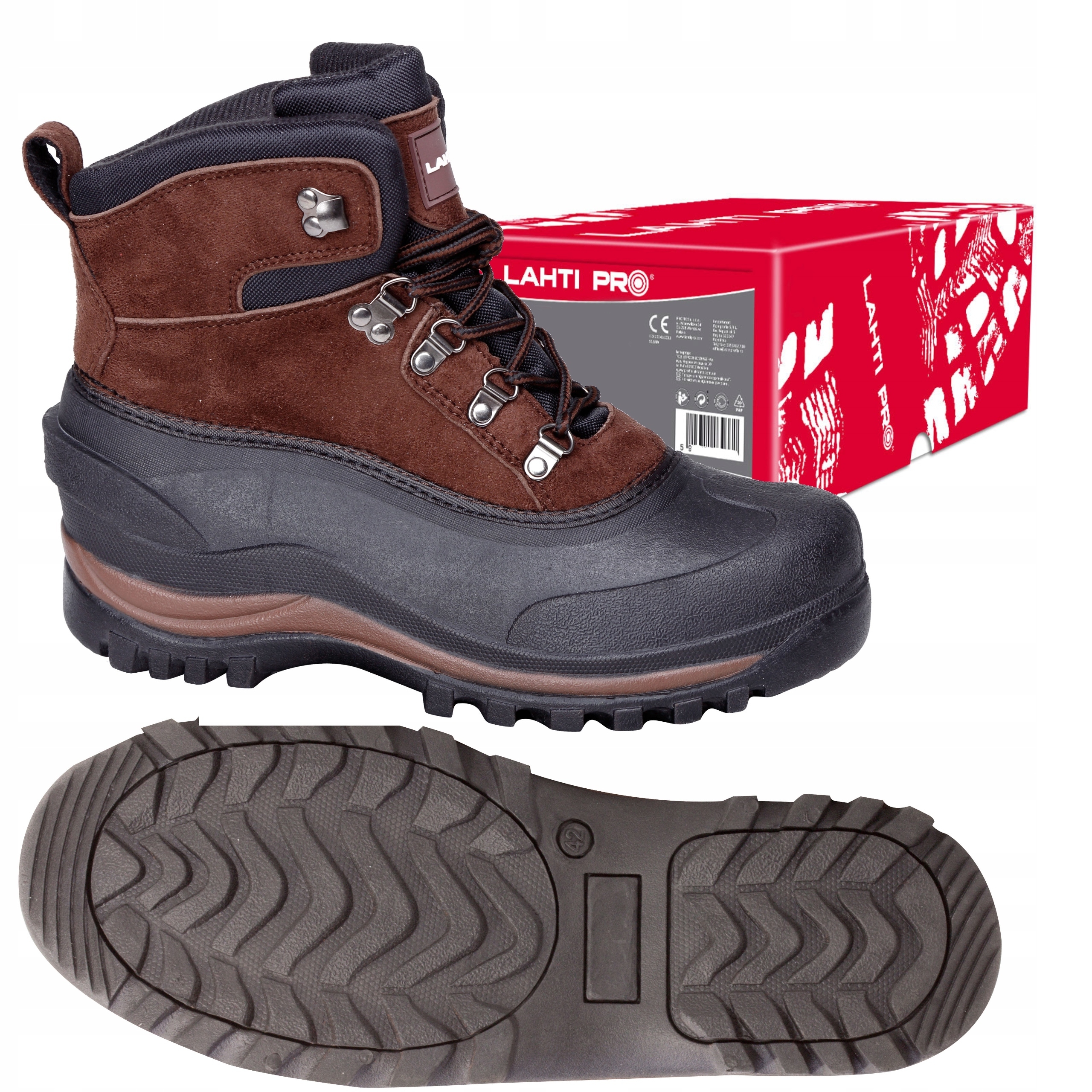 Обувь Lahti Pro изготовлена из прочной искусственной кожи (замши), подкладка – из трикотажного полотна, а сменная меховая подкладка делает обувь очень теплой. Подошва обуви из TPR (Thermo Plastic Rubber, т.е. термопластичная резина). Рабочая обувь, предназначенная для эксплуатации в холодное время года (осень, зима), должна быть, прежде всего, теплой, а также прочной, удобной и адекватно защищающей ноги от травм. Все эти функции доступны в коричневых рабочих ботинках (зимних ботинках) Lahti Pro модели L30804, которые имеют еще одно преимущество – они предлагаются по очень доступной цене при очень высоком качестве изготовления. Снегоступы относятся к первой категории средств индивидуальной защиты.