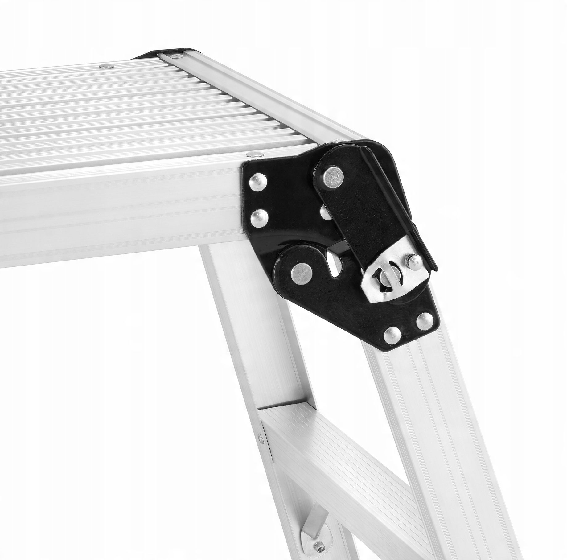 Рабочая платформа HIGHER – это прочный и профессиональный инструмент, о чем свидетельствует высокое качество изготовления и усиленная конструкция лестницы. Сама платформа смонтирована на алюминиевой раме и усилена целых 3-мя алюминиевыми поперечинами, что гарантирует высокую жесткость платформы. Ступени платформы дополнительно усилены по 2 опоры на каждую ступень, благодаря чему ступени не деформируются под воздействием эксплуатации. Опоры очень важны с точки зрения увеличения прочности всей платформы, ведь при подъеме и спуске именно на ступеньку оказывается наибольшее давление и нагрузка.