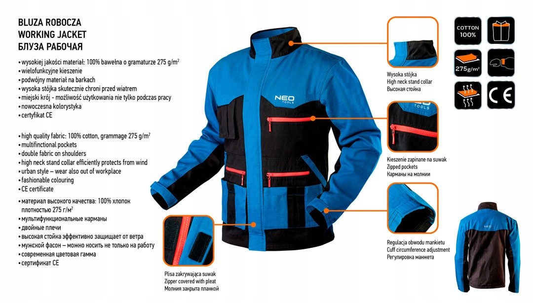 Рабочая толстовка NEO из серии HD+ из высококачественного хлопка. ткани. Толстовка обеспечивает комфорт использования благодаря своей особой конструкции. рукав, регулировка манжет и высокий воротник-стойка. Продукт имеет комбинация многофункциональных карманов, застегивающихся на застежку-молнию и кнопки. Двойной материал на плечах обеспечивает более высокую устойчивость к повреждениям. механический. Толстовка отличается смелым цветовым сочетанием и современным кроем. позволяет использовать продукт и вне работы. Это гарантия качества Европейский сертификат и исполнение в соответствии со стандартом EN ISO 13688:2013. Отметка NEO оправдывает ожидания профессионалов.