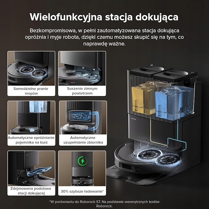 - Док -станция типа «Все в одном»: усовершенствованная док -станция автоматически опустошает пыль в герметичную сумку с емкостью 2,7 литра в течение периода до 7 недель, добавляет воду из 4 -литрового резервуара в бак 330 м², тщательно чистит швабру и высушивая ее, гарантируя, что работник является доктором. Всегда готов к следующей уборке.