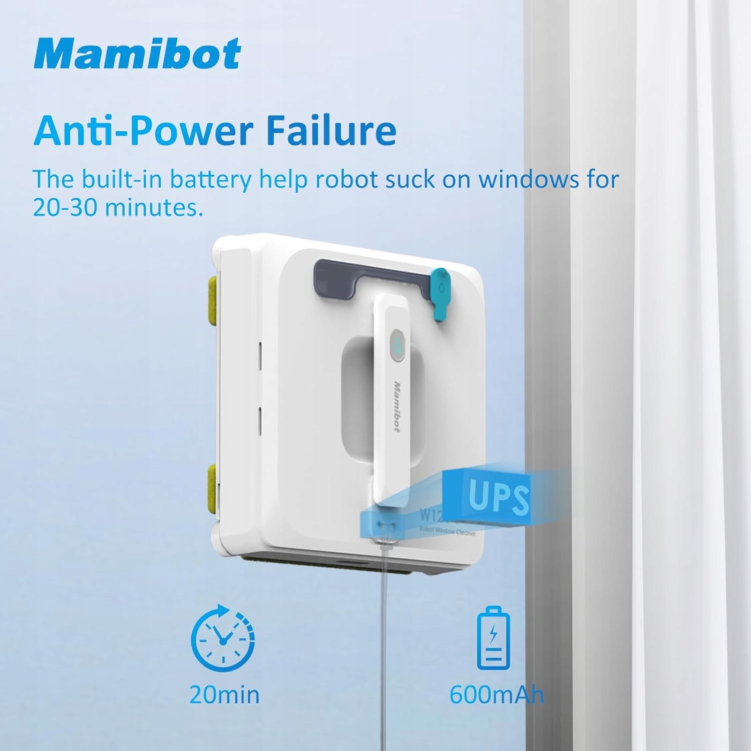 1. Машина оснащена внутренней батареей. В случае случайного нарушения внешней энергии автоматическое аварийное торможение обеспечивает 20 минут всасывающей мощности, поэтому машина не упадет. На этом этапе вы можете использовать пилот с безопасной веревкой для удаления машины