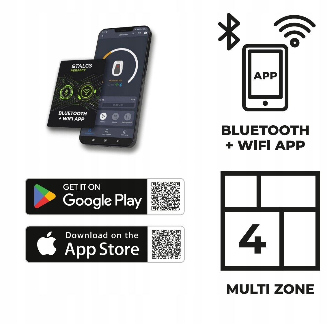 Роботы-косилки Stalco Perfect оснащены встроенным дисплеем и кнопками для удобного управления. Через мобильное приложение вы можете получить более расширенные настройки и управлять роботом-косилкой удаленно через Wi-Fi или Bluetooth. Приложение доступно для загрузки в магазинах приложений iOS или Android. С его помощью можно составить индивидуальный план кошения на конкретный день, включить или выключить робот-косилку, проверить уровень заряда аккумулятора или текущее рабочее состояние машины. Кроме того, с помощью приложения мы можем настроить до 4 зон кошения и даже определить, через какое время после дождя робот-косил должен вернуться в работу.