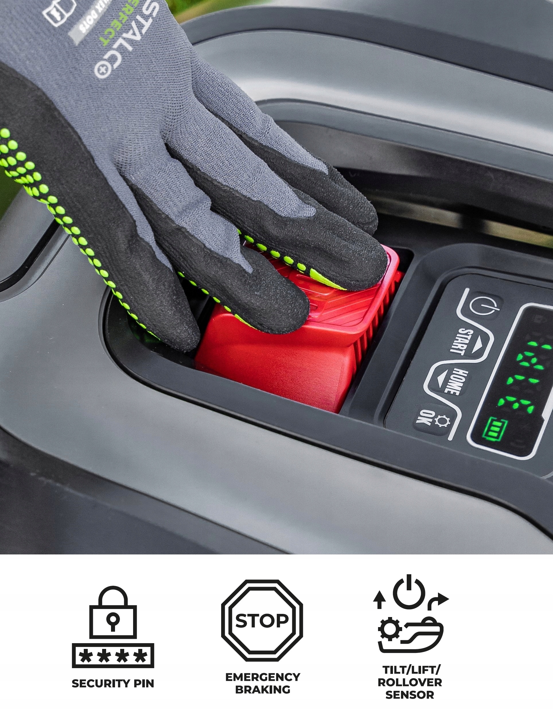 Робот-косилка также оснащена системой ручной остановки машины, благодаря которой при необходимости вы можете немедленно остановить ее работу, нажав красную кнопку на верхней части робота-косителя. Кроме того, машина защищена PIN-кодом, который защищает ее от несанкционированного запуска или изменения настроек. Робот также оснащен датчиками наклона или опрокидывания, благодаря которым машина автоматически отключается, гарантируя высокий уровень безопасности во время работы.