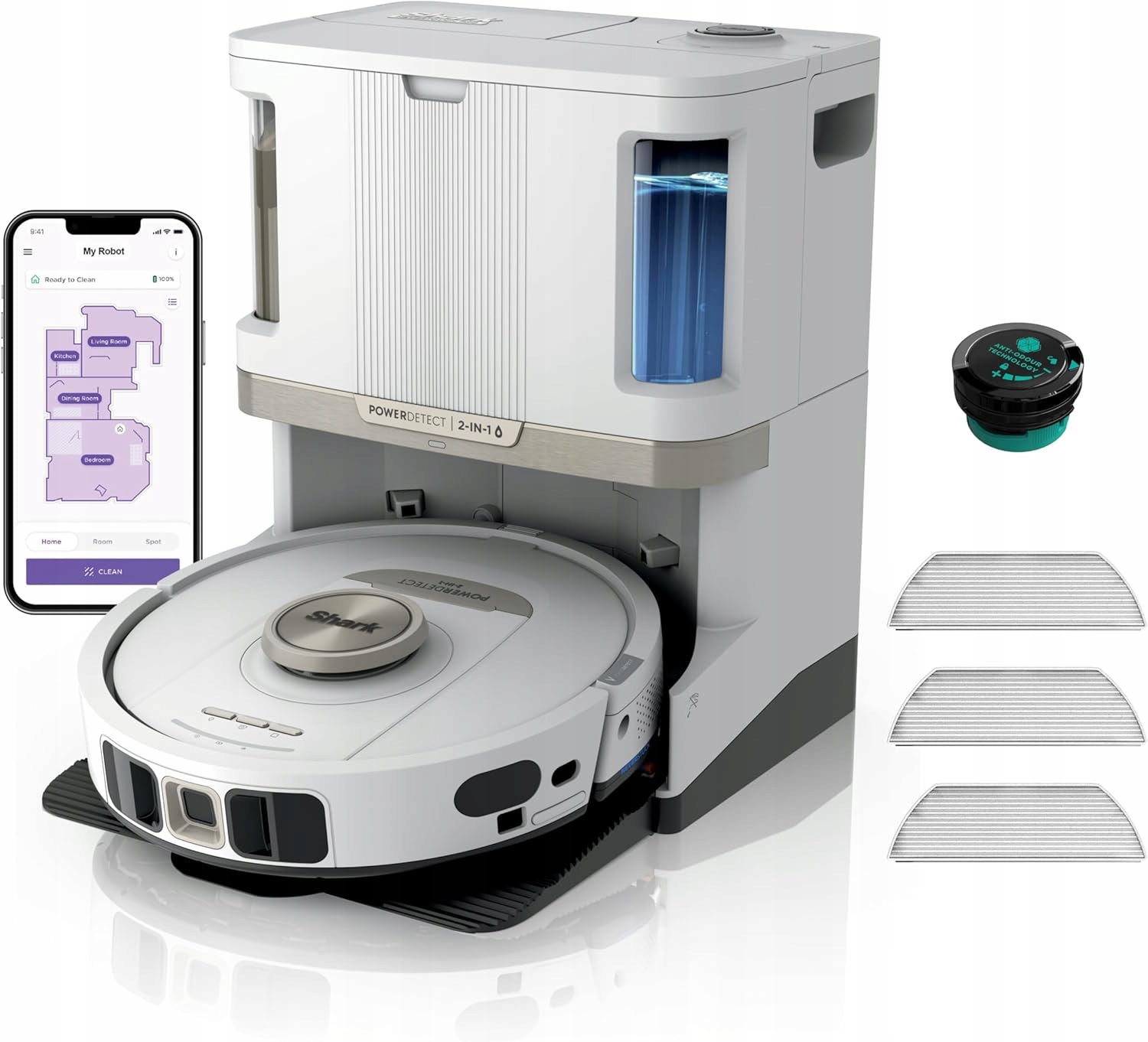 - В КОМПЛЕКТ ВХОДЯТ: 1 робот-пылесос и моющая машина Shark PowerDetect, 1 станция NeverTouch, 1 картридж против запаха, 3 протирочные подушечки, 1 боковая щетка, 1 фильтр