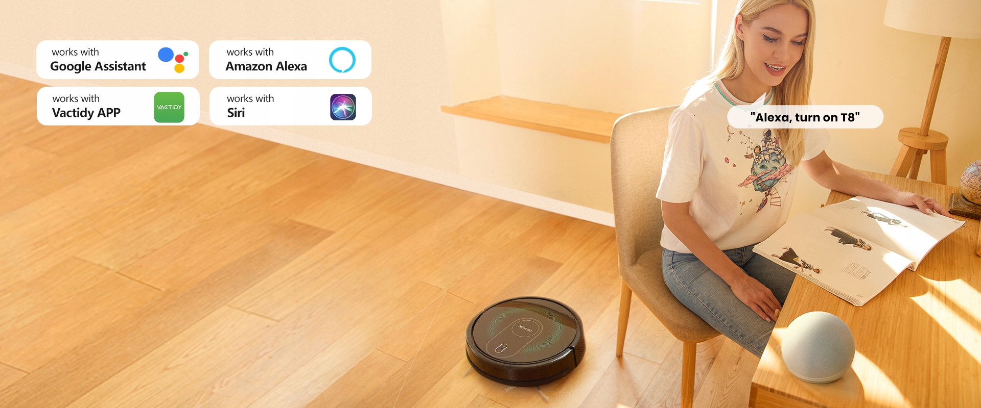 Вы можете легко спланировать задачи очистки, когда вы снаружи, выберите режим очистки и управляйте направлением очистки, используя приложение Vactida Smart. Он также может обрабатывать голосовые команды, используя Google Home и Amazon Alexa.