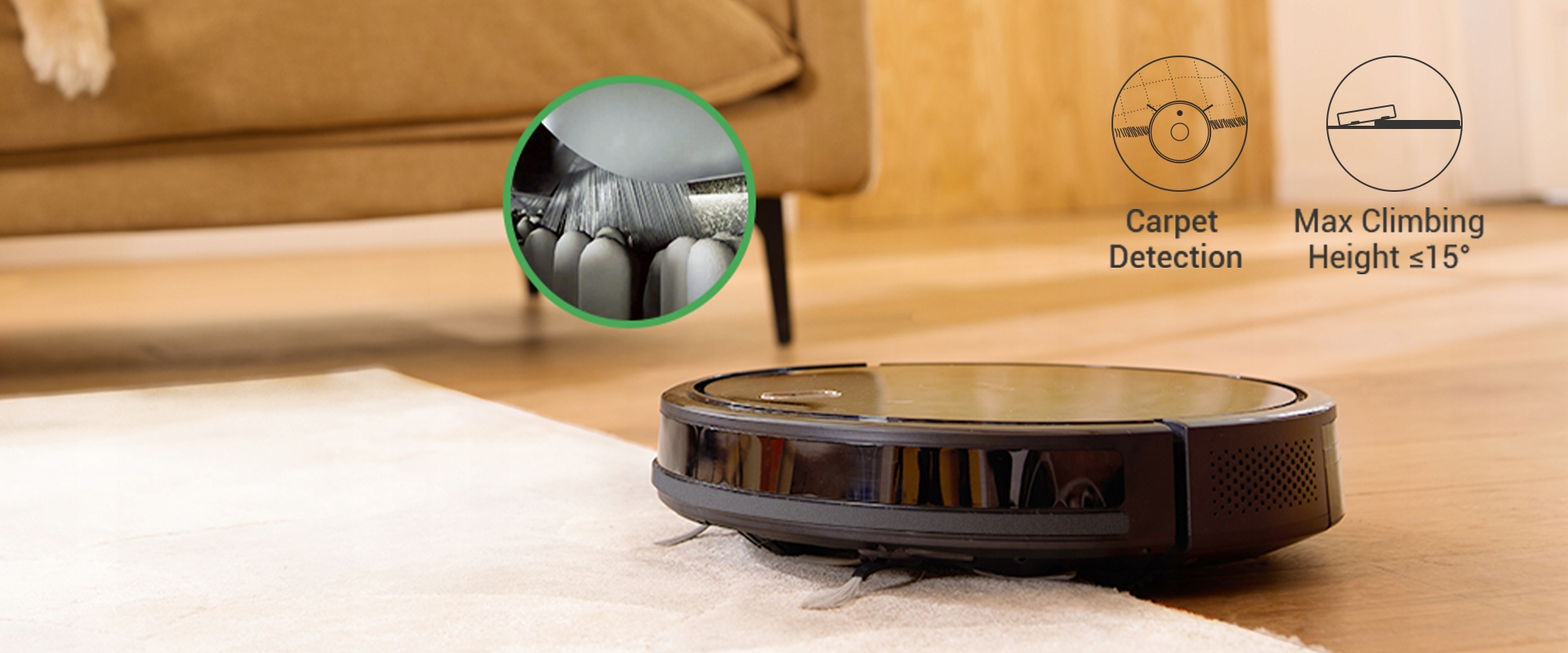 автоматически переключается на режим максимума при пылесосе ковра и может подняться на высоту менее 15 °. По сравнению с моделью с самим отверстием всасывающего отверстия, роликовая щетка имеет более сильную адгезию на коврах, более эффективно собирая глубоко скрытые примеси.