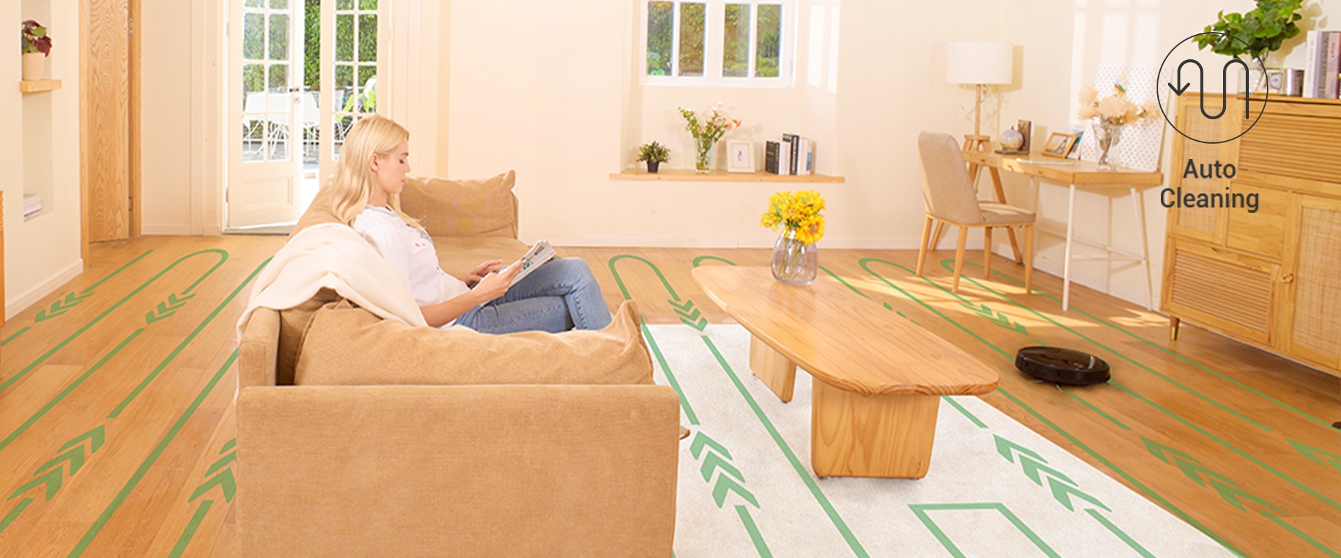 Гибкий переключение между 4 режимами очистки с использованием дистанционного управления и приложения. Маршрут очистки в Зигзаке максимизирует диапазон очистки, уменьшает количество пропущенных сканирований и отвечает ежедневным потребностям очистки. (1) Автоматическая очистка (2) Очистка комнаты: планирование маршрута в зигзаге (3) Очистка краев (4) Очистка точек.