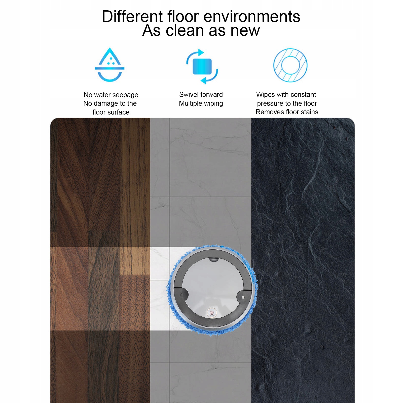 2. МНОГОФУНКЦИОНАЛЬНАЯ ОЧИСТКА: подходит для различных напольных покрытий, может вращаться вперед, не повреждая пол, и удалять пятна с пола путем многократного протирания и постоянного давления на салфетки для пола.