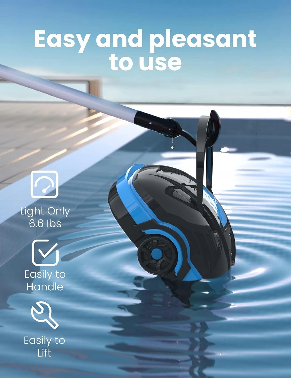 Универсальный и светлый: благодаря весу всего 3,6 кг, робот идеально подходит для плоских поверхностей земли и утопленных бассейнов (максимальный уклон <15 °) и для различных покрытий и форм (ПВХ, плитки, виниловые или распылительные покрытия в круглом, прямоугольном или овальном). Легкое техническое обслуживание: простое в очистке, просто ополаскивайте змеей - для удобного и быстрого обслуживания. Этот робот беспроводного бассейна является надежным партнером для без проблем и тщательной очистки бассейна, чтобы всегда предоставить вам кристально чистую воду. Интеллектуальная технология: автоматическое обнаружение краев дает, чтобы робот возвращался к краю бассейна, когда аккумулятор плохая или чистка завершена. Длинное время автономной работы: оборудован постоянной батареей, робот позволяет непрерывно рабочее время в бассейне 50 минут, чтобы тщательно очистить каждый угол. Эффективная система очистки: два приводных колеса, двух этажа и точный точный фильтр 180 мкм обеспечивают высокую силу всасывания и глубокую очистку. Откройте для себя робот беспроводного бассейна, который был разработан для легкой и эффективной очистки, благодаря тому, что ваш бассейн всегда остается освежающе чистым