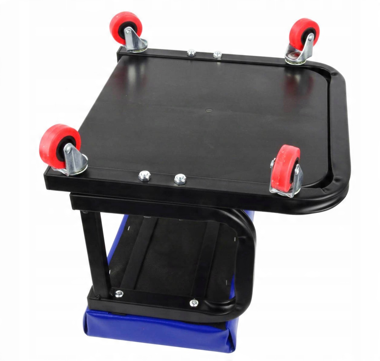 Рабочий стол со стальной конструкцией, четырьмя поворотными на 360 градусов роликами, мягким сиденьем и разделенной полкой для инструментов. Максимальная грузоподъемность 136 кг. Табурет оснащен колесиками и скрытым ящиком для аксессуаров. Стабильная конструкция и мягкое сиденье – преимущества этого изделия.
