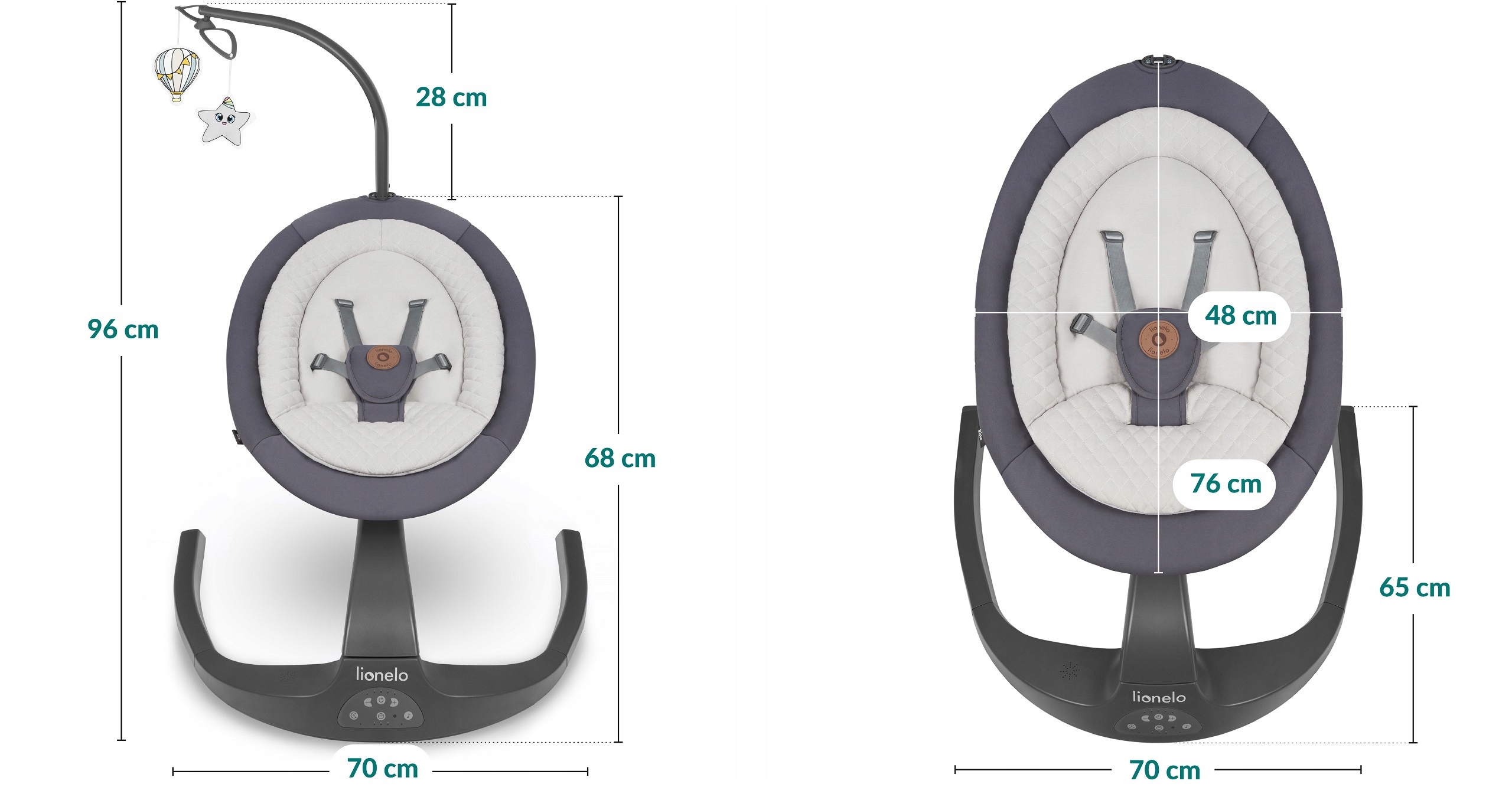 Вращающееся сиденье качалки Lionelo Rina позволяет не только менять направление качания, но и регулировать сиденье так, чтобы что вы всегда можете поддерживать зрительный контакт с ребенком.