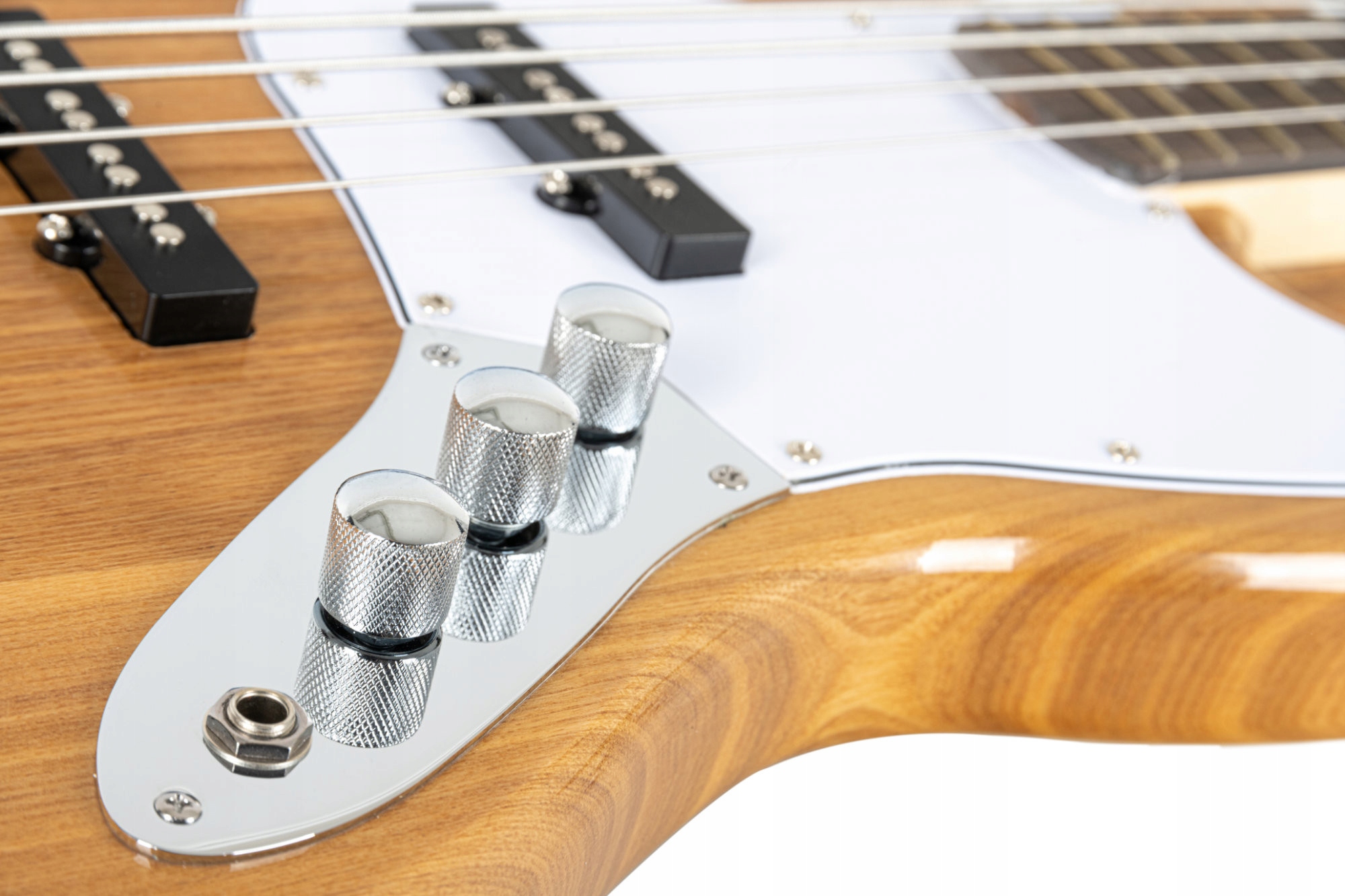 Электрическая джазовая бас-гитара в натуральной версии с корпусом из ясеня, грифом из клена и двумя звукоснимателями с одной катушкой.