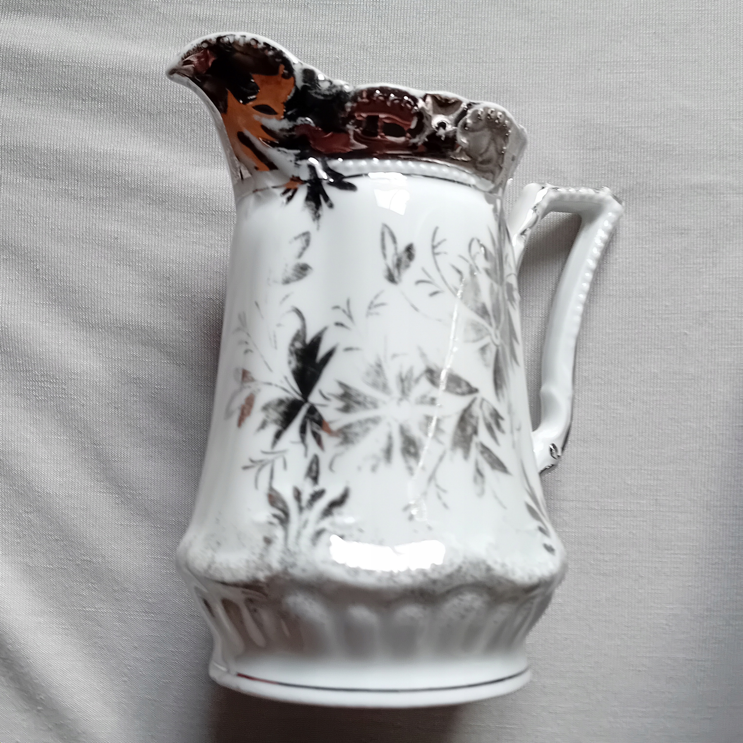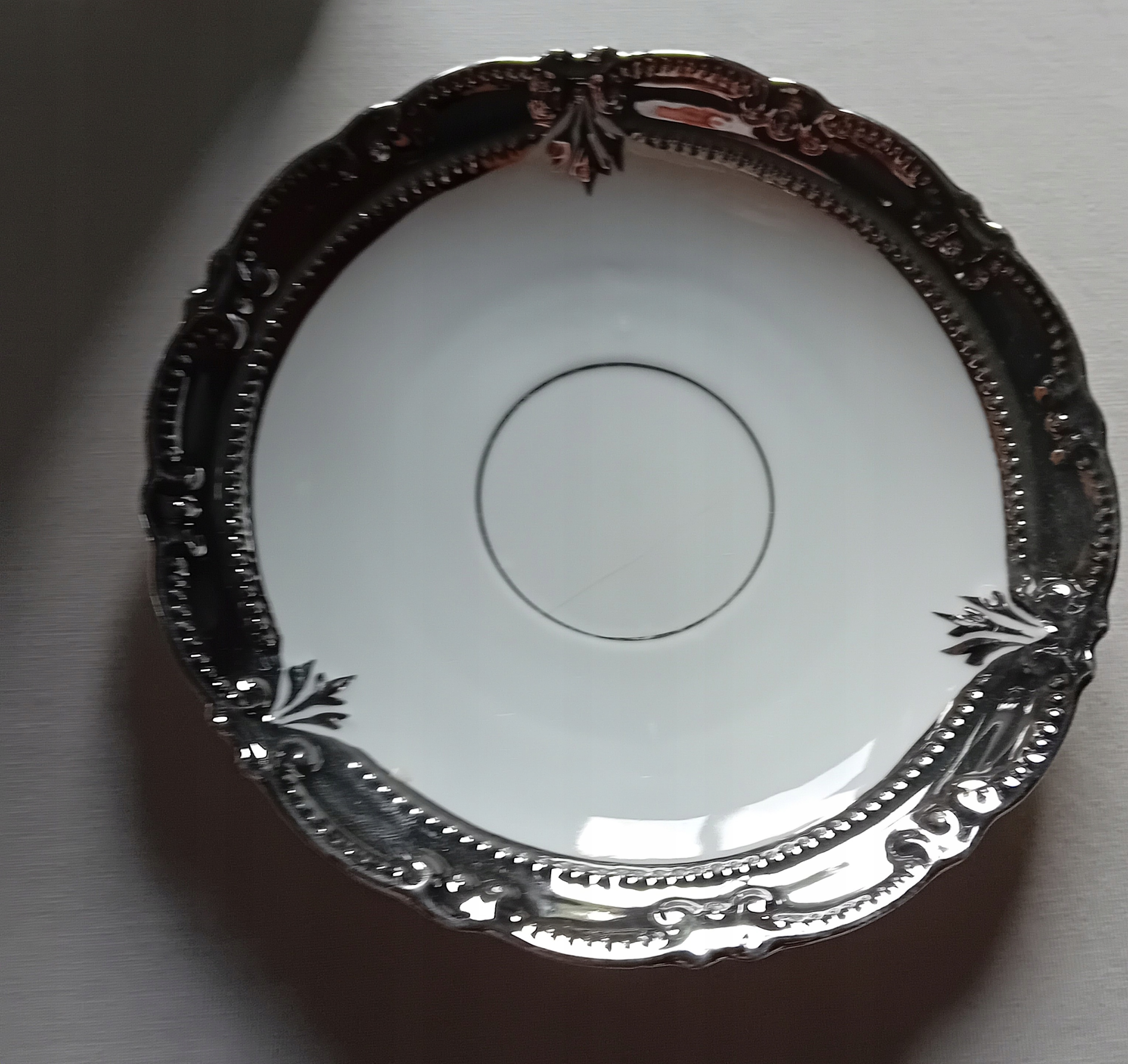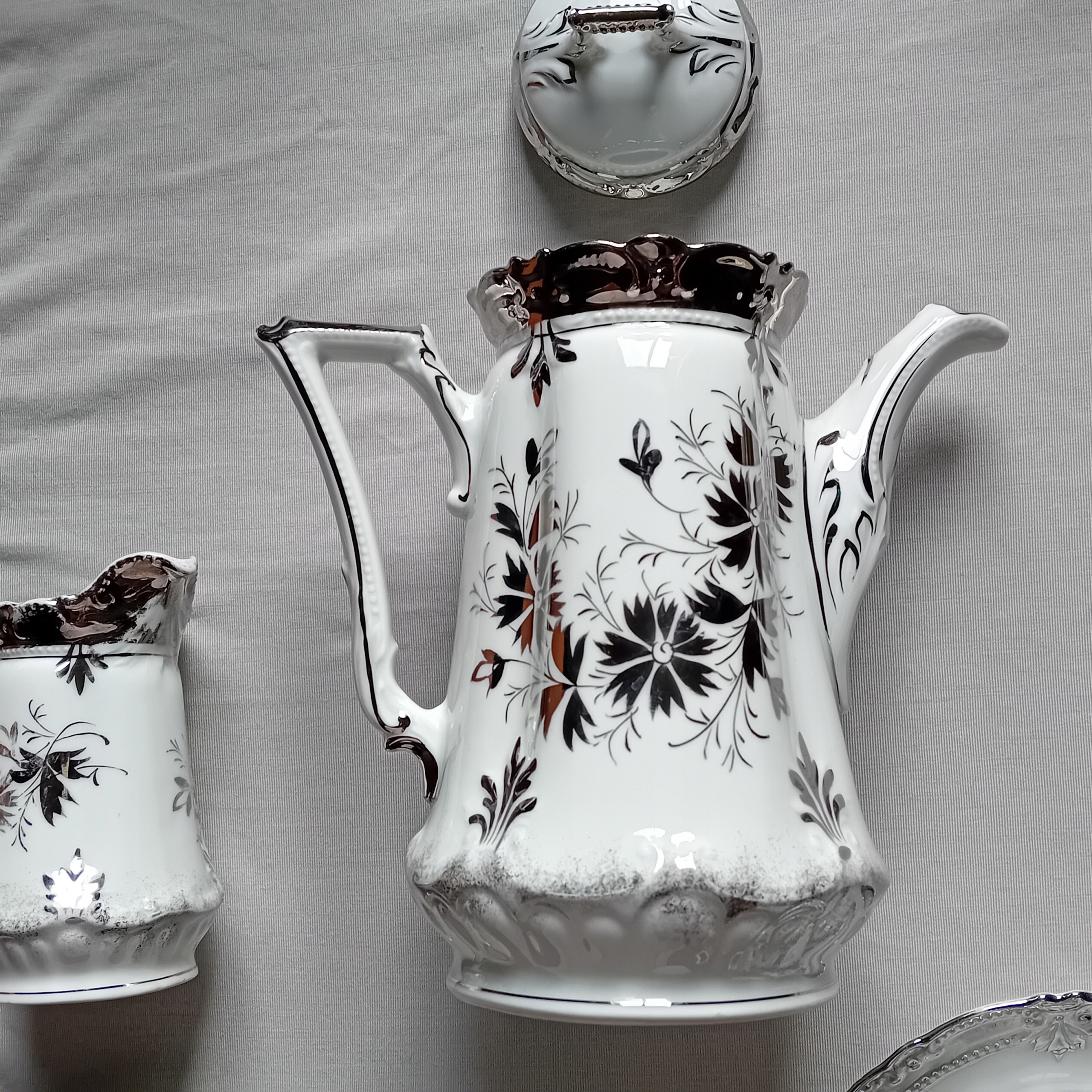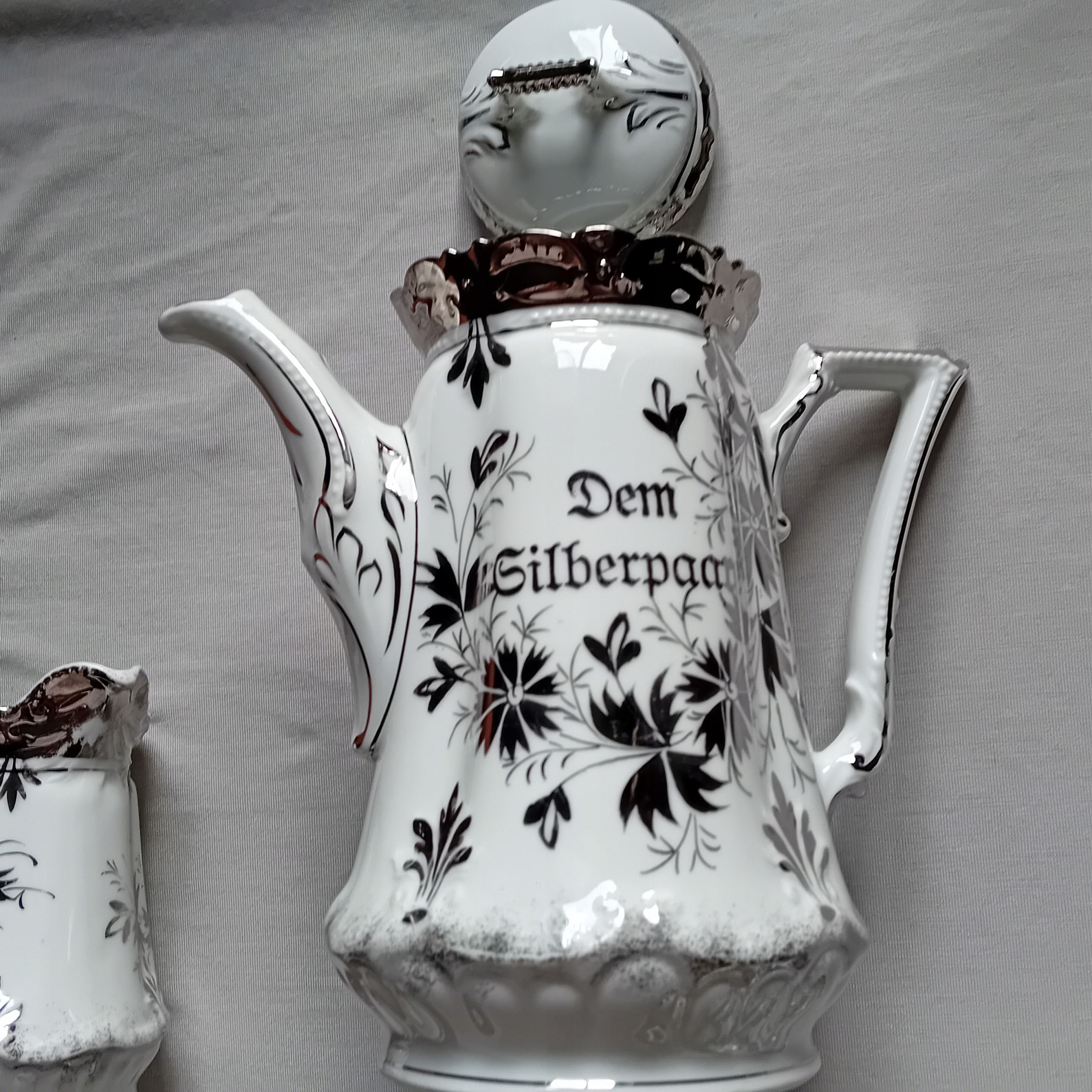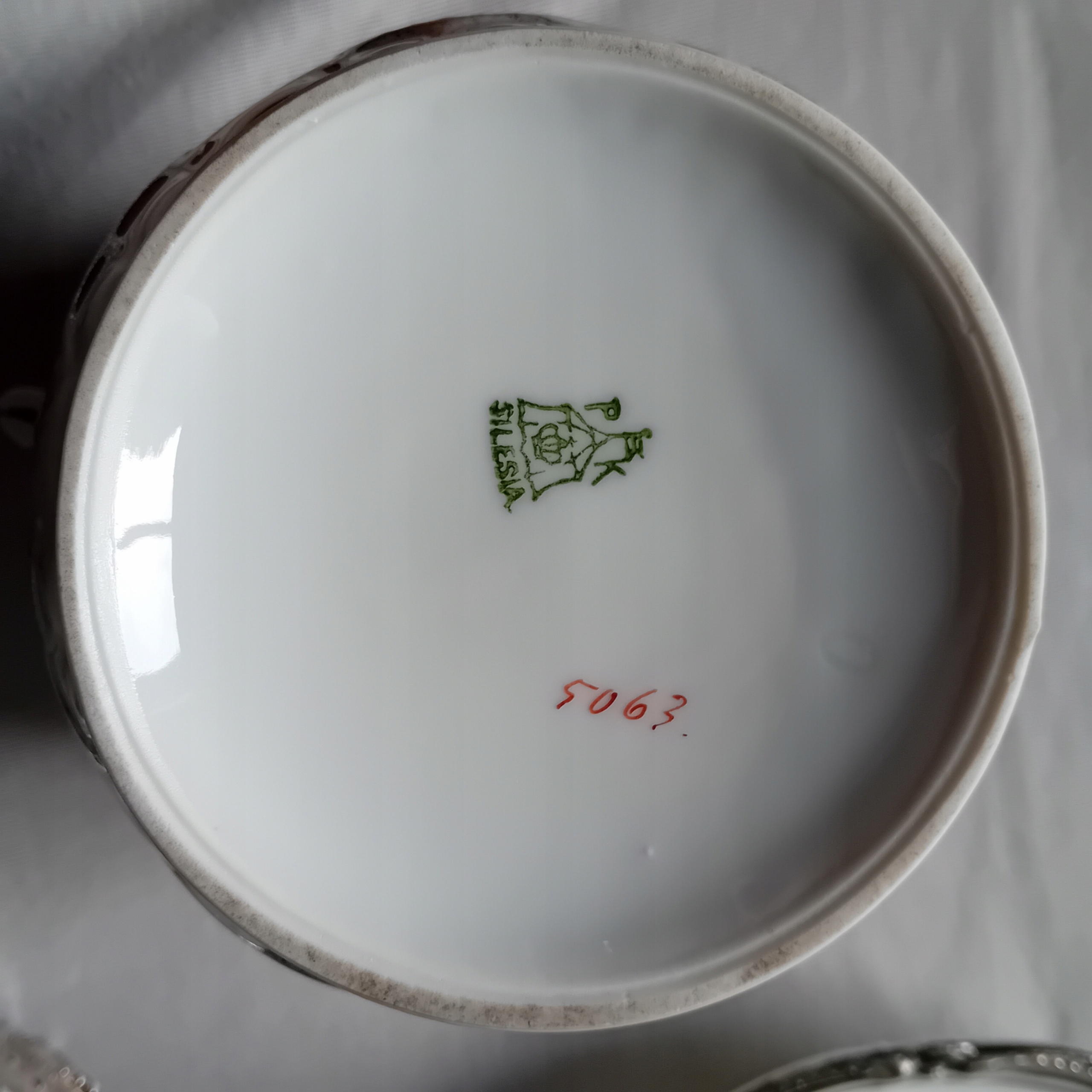 Продаю центральную часть стола - кувшин, молочник и сахарницу, а также два блюдца. Фарфор Кенигзельт, марка 1896-1922 годов. По данным Энциклопедии силезского фарфора, сервиз создан около 1900 года. Фарфор в эклектическом стиле, богато украшенный серебром. Размеры кувшина: высота 18 см. , с крышкой 22 см. Диаметр (сверху) 9/12,5/9,5 см. Высота молочника 12 см. , диаметр (сверху) 6/7,5/6 см. Высота сахарницы 9,3 см. , диаметр (сверху) 9/10,5/9 см. Дополнительно для блюдца диаметром 16,5 см. Кувшин, сахарница и одно блюдце в хорошем состоянии, есть небольшие потертости серебряного покрытия по краям. Емкость для молока не повреждена, но имеет видимые потертости на серебряном покрытии вокруг заливной горловины. Второе блюдце имеет небольшие трещинки посередине дна – так называемые паутинка, поэтому покупателю предоставлю ее бесплатно. Цена указана за комплект - кувшин, молочник, сахарница + 1 блюдце.