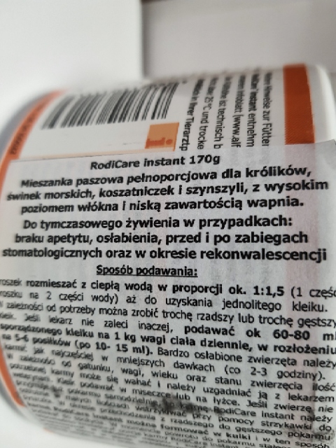 Если питомец больше не ест самостоятельно, растворимый корм RodiCare следует осторожно вводить в рот в небольших количествах с помощью шприца.