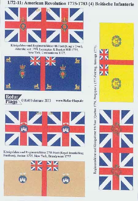 Знамя полка и королевское знамя 4-го пехотного полка (Королевский), Америка с 1774 г. Лексингтон и Банкер-Хилл, 1775 г., Нью-Йорк, Джермантаун, 1777 г. / 27-е полковое знамя и королевское знамя Фут (Королевские фузилеры Иннискиллинга), Бостон, 1775 г. Нью-Йорк, Брендивайн, 1777 г. / Полковое знамя и королевское знамя 9-го пехотного полка (Квебек, 1776 г., Бургойн, 1777 г. - Фельдцуг, Саратога, 1777 г.).