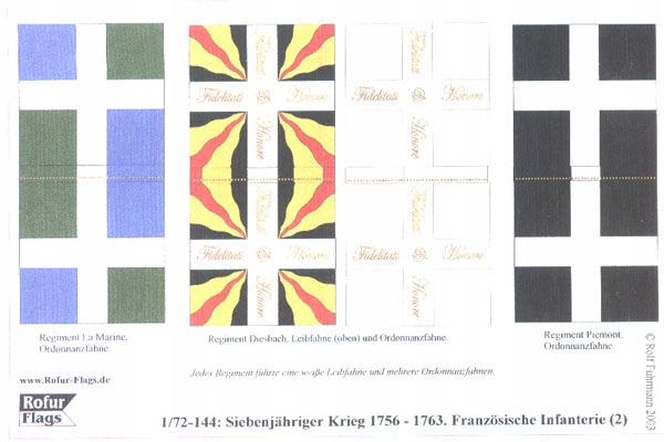 Каждый полк имел один белый флаг и несколько «артиллерийских флагов» одинакового дизайна. Полк Ла Марин, артиллерийский флаг / Полк Дисбах, белый флаг и артиллерийский флаг / Полк Пьемонт, артиллерийский флаг