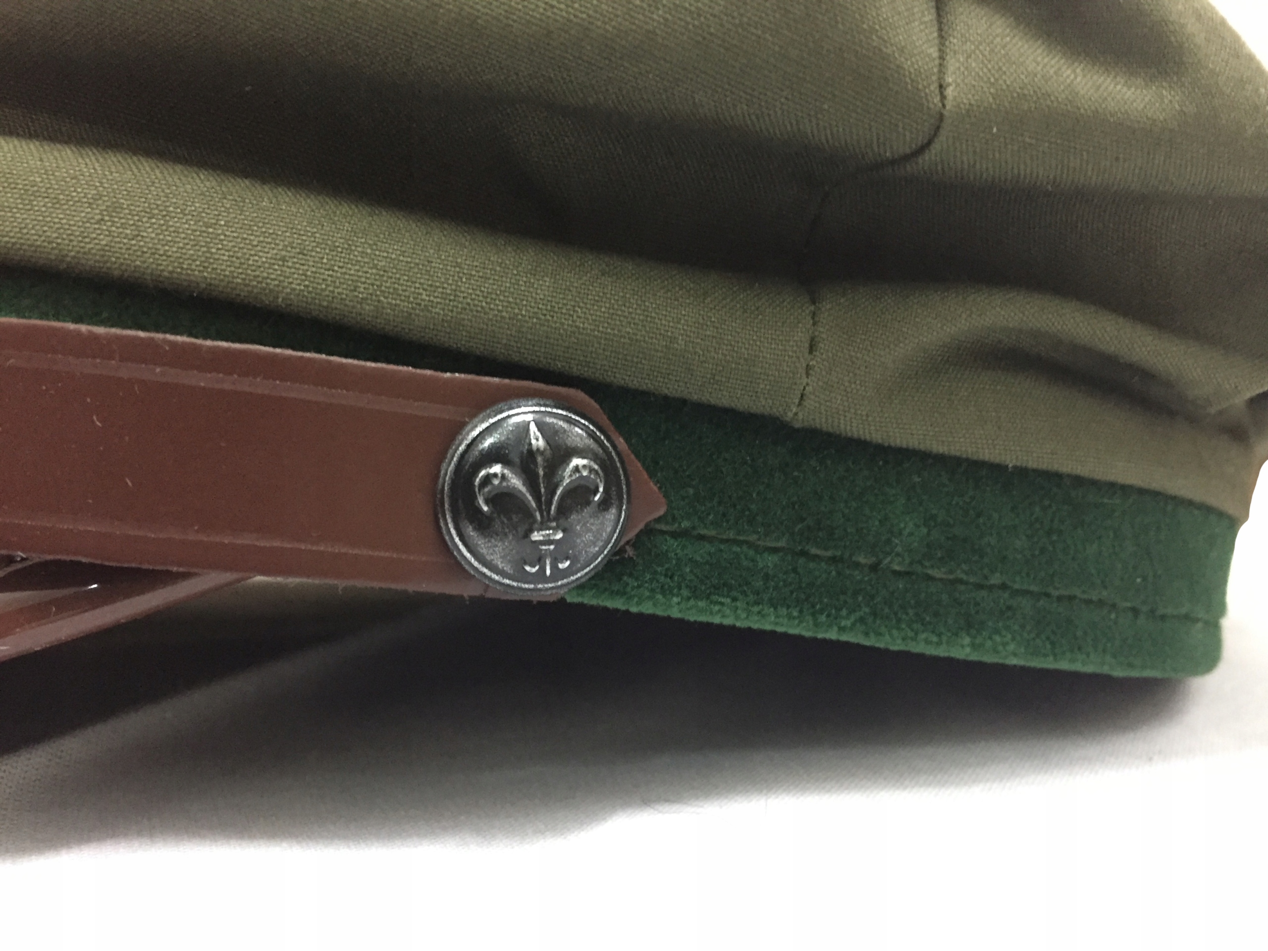 - Ремешок над козырьком выполнен из темно-коричневой кожи и имеет флисовую отделку.