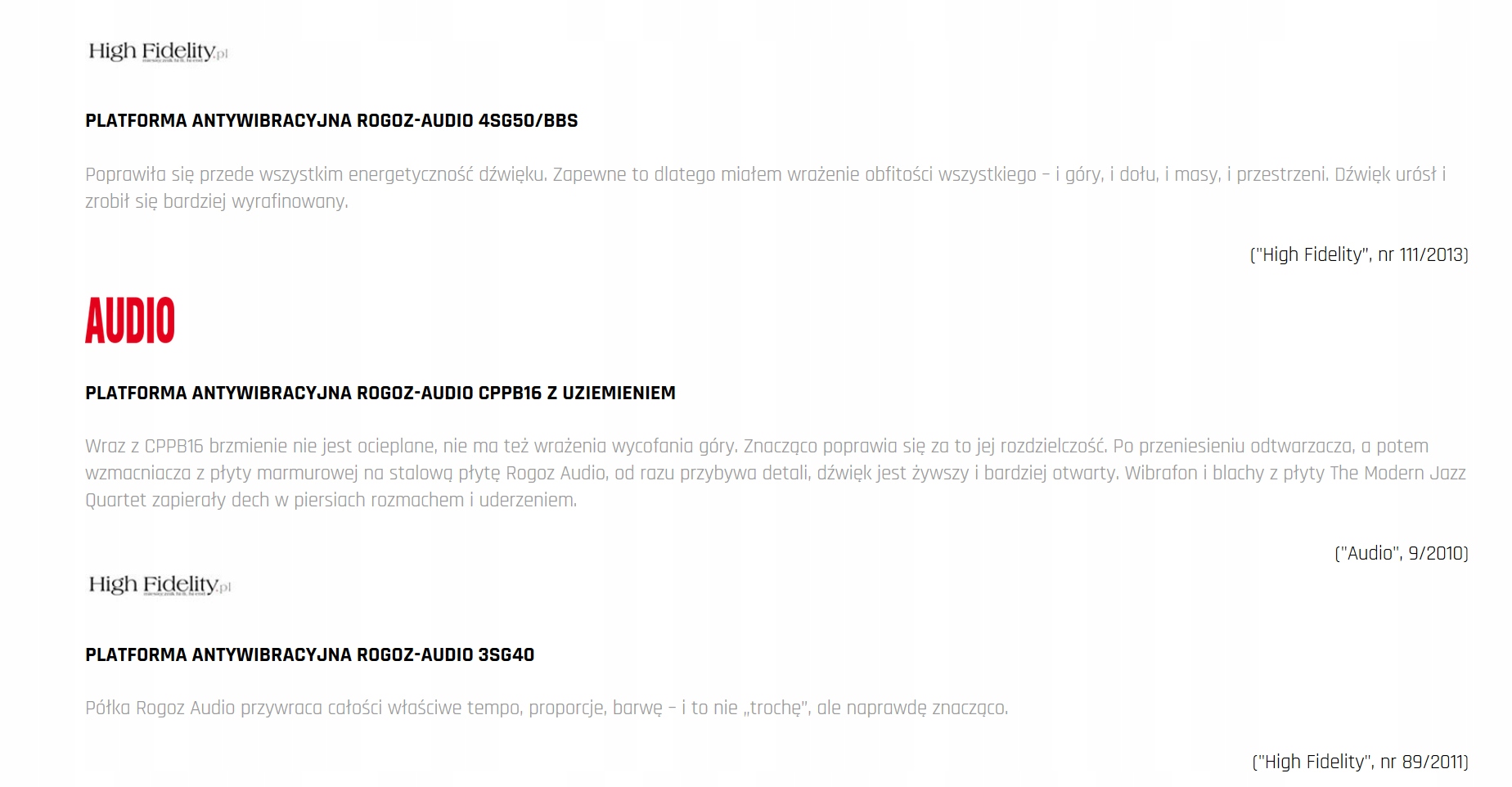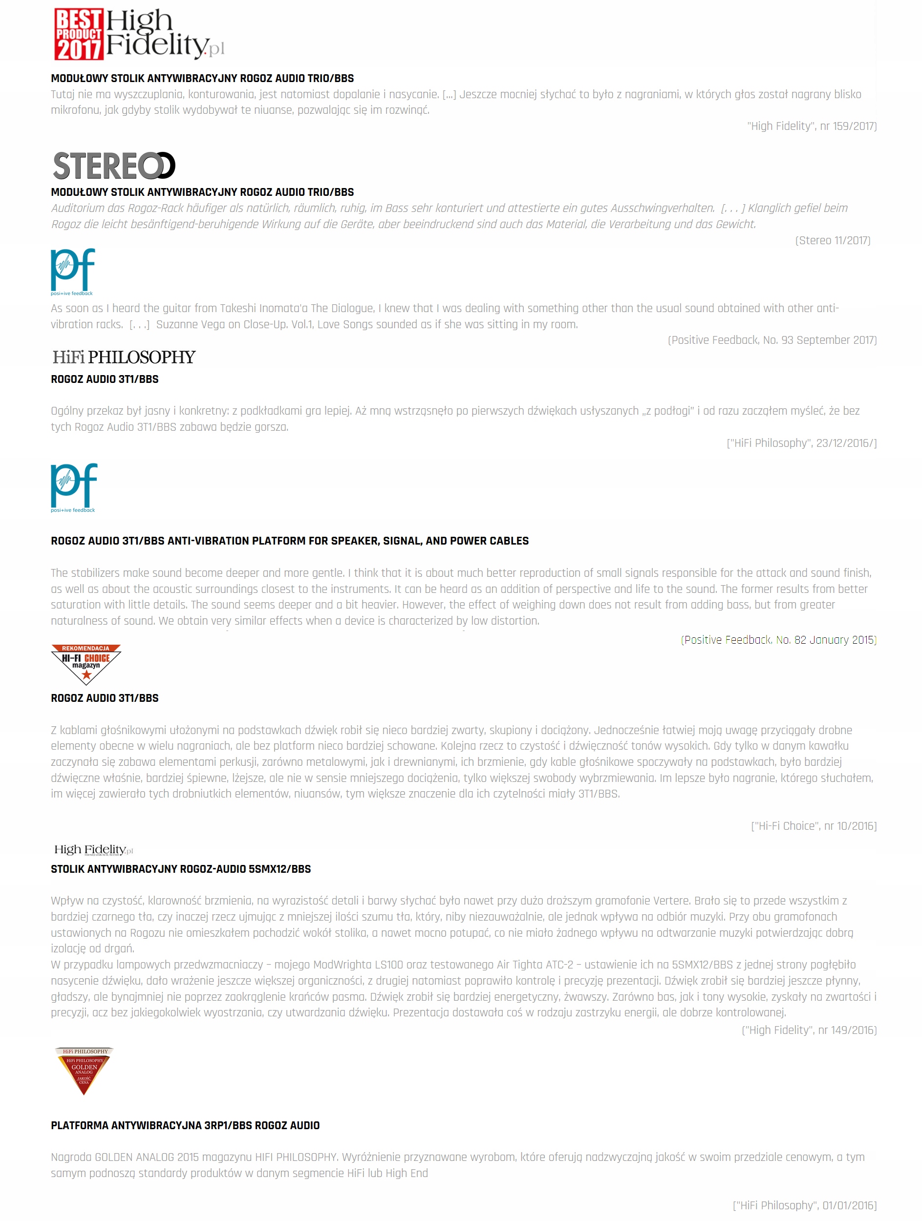 Продукция Rogoz Audio по достоинству оценена профессионалами аудиоиндустрии и отдельными клиентами. Положительное влияние мебели Рогоз Аудио на звук доказано результатами прослушиваемых тестов и наградами специализированных зарубежных и отечественных журналов, таких как немецкий STEREO, американский POSITIVE FEEDBACK, 6 MOONS, AUDIO VIDEO, HI-FI CHOICE, AUDIO, ВЫСОКАЯ ВЕРНОСТЬ, АУДИОСТЕРЕО, ГИФИФИЛОСОФИЯ - протестированные антивибрационные столы, платформы и стойки для колонок получили высшие оценки во всех категориях: звук, возможности, конструкция, дизайн, награды за лучшую покупку, награды «Продукт года» / «Лучший продукт года» (2014 г.). , 2015, 2017), премия «КРАСНЫЙ ОТПЕЧАТОК».