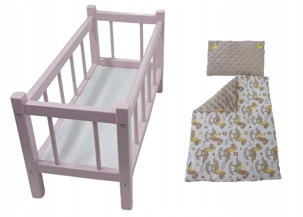 Розовая деревянная кровать + постельное белье с 3 элементами для кукол