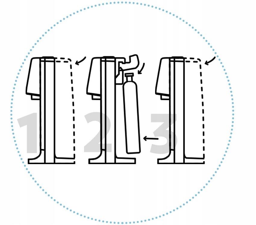 Сборка розового газового баллона за 3 простых шага: 1. Поместите кофемашину SodaStream на устойчивую плоскую поверхность в вертикальном положении и снимите ее заднюю крышку. 2. Установите газовый баллон на место крепления, начиная снизу. Затем опустите розовый рычаг быстрого подключения. 3. Установите заднюю крышку кофемашины на место, пока не услышите щелчок. Готовый! Теперь вы можете пузыриться.