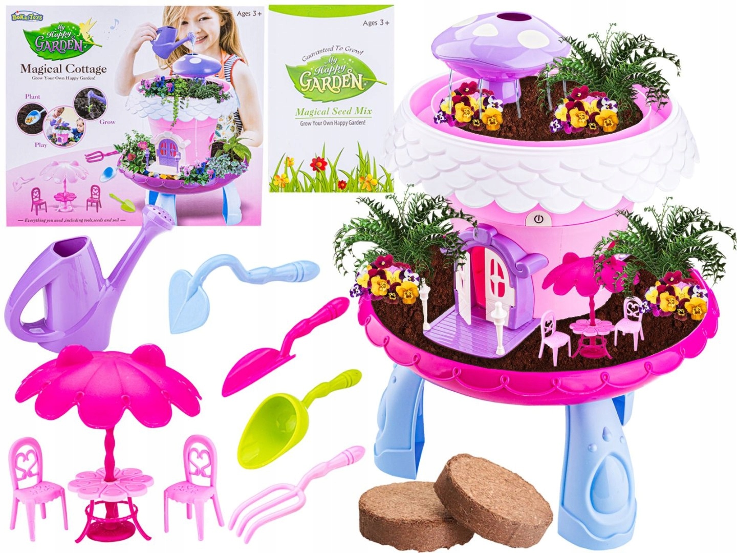 На вершине игрушки есть гриб, который идеально увлажнял наши растения. Просто налейте в него воду, чтобы увидеть настоящий фонтан. Конец / рама верхнего горшка - это туннель, которому мы увидим аналогичный эффект после заливки воды. Вода будет капать в 4 отверстия и более низкий уровень. Семена,