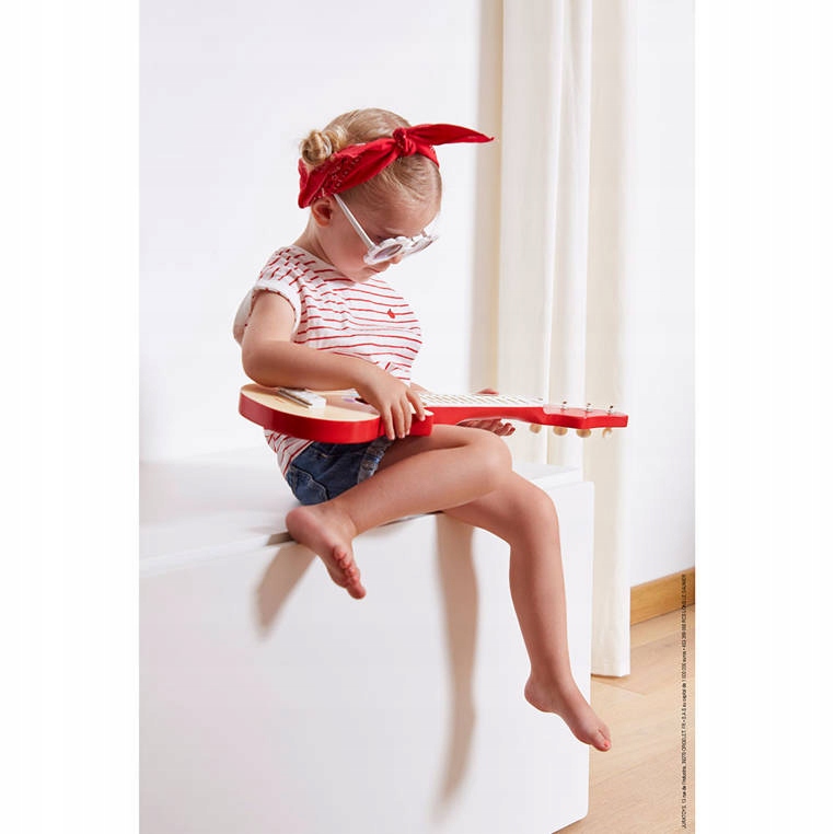 Рок-гитара из серии Confetti французского бренда JANOD – идеальная первая музыкальная игрушка для ребенка, способствующая развитию слуха, чувства ритма и музыкальных навыков. Он также поддерживает развитие воображения, концентрации, настойчивости и координации движений. Гитара имеет 4 струны, натяжение которых можно регулировать с помощью ручек, классическую рок-форму, относительно плоский корпус и приятный звук. Ее отличают красивые цвета: натуральное дерево, красный, белый и разноцветные круги.