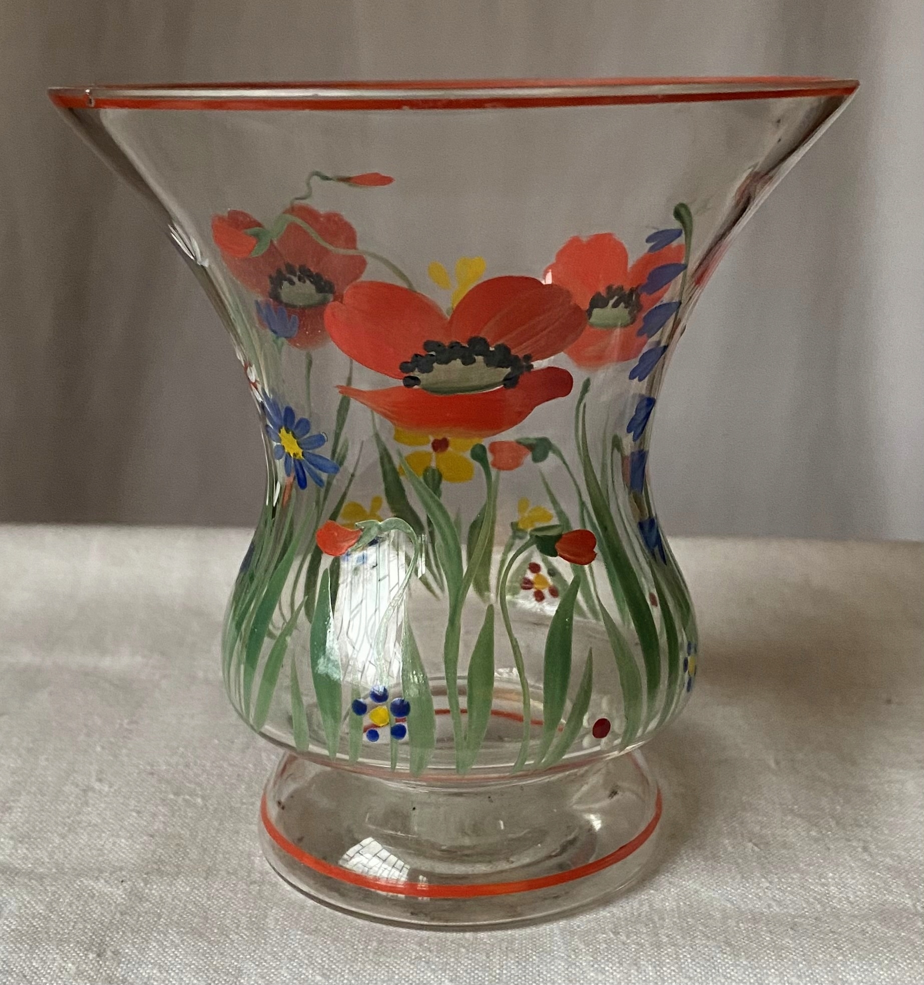 На этом аукционе я предлагаю замечательную, очень старинную стеклянную вазу, расписную, расписанную вручную, чрезвычайно замысловато украшенную вещь. Стекло давно не мыли, поэтому на фотографиях оно может выглядеть немного мрачновато. Предмет пыльный, грязный, естественно патинированный, поскольку привезен прямо из старой, ликвидированной квартиры одного из жителей Белостока. Так что серое свечение – это не что иное, как пыль и грязь, а не естественный цвет вазы. Все это на самом деле кристально прозрачно и украшено вручную красочной росписью: растительным орнаментом, истинно польским узором. У нас тут маки, васильки, ромашки... Ваза для своего возраста в отличном состоянии. Его очень уважают, видно, что он был кому-то важен. По внешнему краю, по красному краю, есть микросколок (см. фото №7), но достаточно лишь пятна красной краски, чтобы его совсем не было видно.