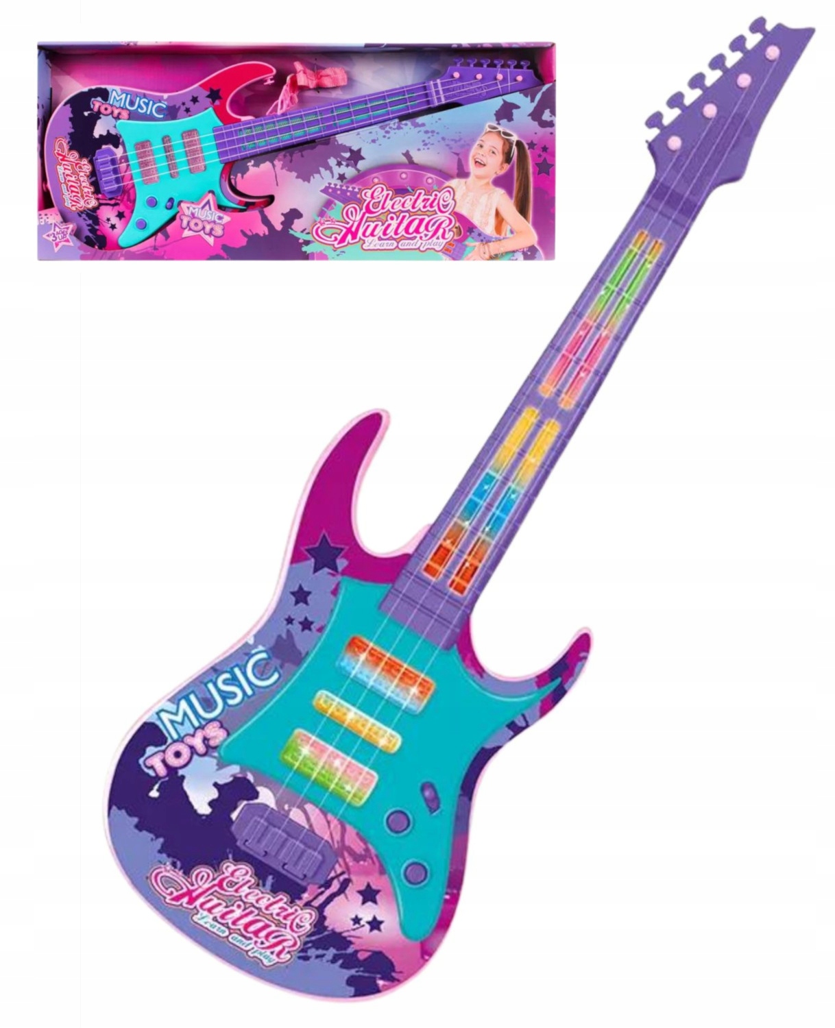 Он также имеет красочную подсветку, которая является привлекательным визуальным элементом музыки и создает приятную атмосферу во время игры. Легко носить с собой, дети могут почувствовать себя настоящими музыкантами, прикрепив дополнительный ремень для гитары во время игры!