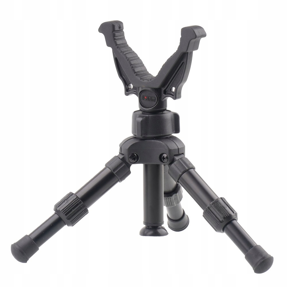 Стрелковый штатив с регулировкой высоты, с возможностью демонтажа центрального оголовья и использования его отдельно. Каждая ножка имеет отдельную регулировку длины и нескользящую ножку. V-образная опора с резиновым покрытием позволяет безопасно и удобно удерживать любое длинноствольное оружие.