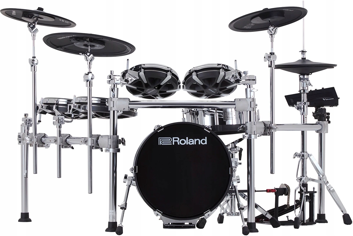 Roland TD716 — «флаг» 7-й серии — комплект, сочетающий в себе эргономику акустики с точностью цифровых пэдов и студийным рабочим процессом. Говоря простым языком: вы играете как бронза и дерево, но у вас тишина, повторяемость и полный контроль над каждым элементом. 14-дюймовый малый барабан с пружинным рычагом (PD-14DSX), 18-дюймовый райд с приглушением пальца (CY-18DR), 14-дюймовый хай-хэт на стойке (VH-14D), полноразмерный 18-дюймовый бас-барабан в деревянном корпусе (KD-18-BK) и новые томы PD-10X/PD-12X составляют набор, который является просто «инструментом». Модуль V71 объединяет все воедино: слайдеры разделов, готовые пресеты, EZ Edit, импорт сэмплов и слоев, 32 аудиоканала через USB, восемь прямых выходов, Bluetooth и Wi-Fi. Это уровень, на котором электроника перестает беспокоить и начинает помогать.
