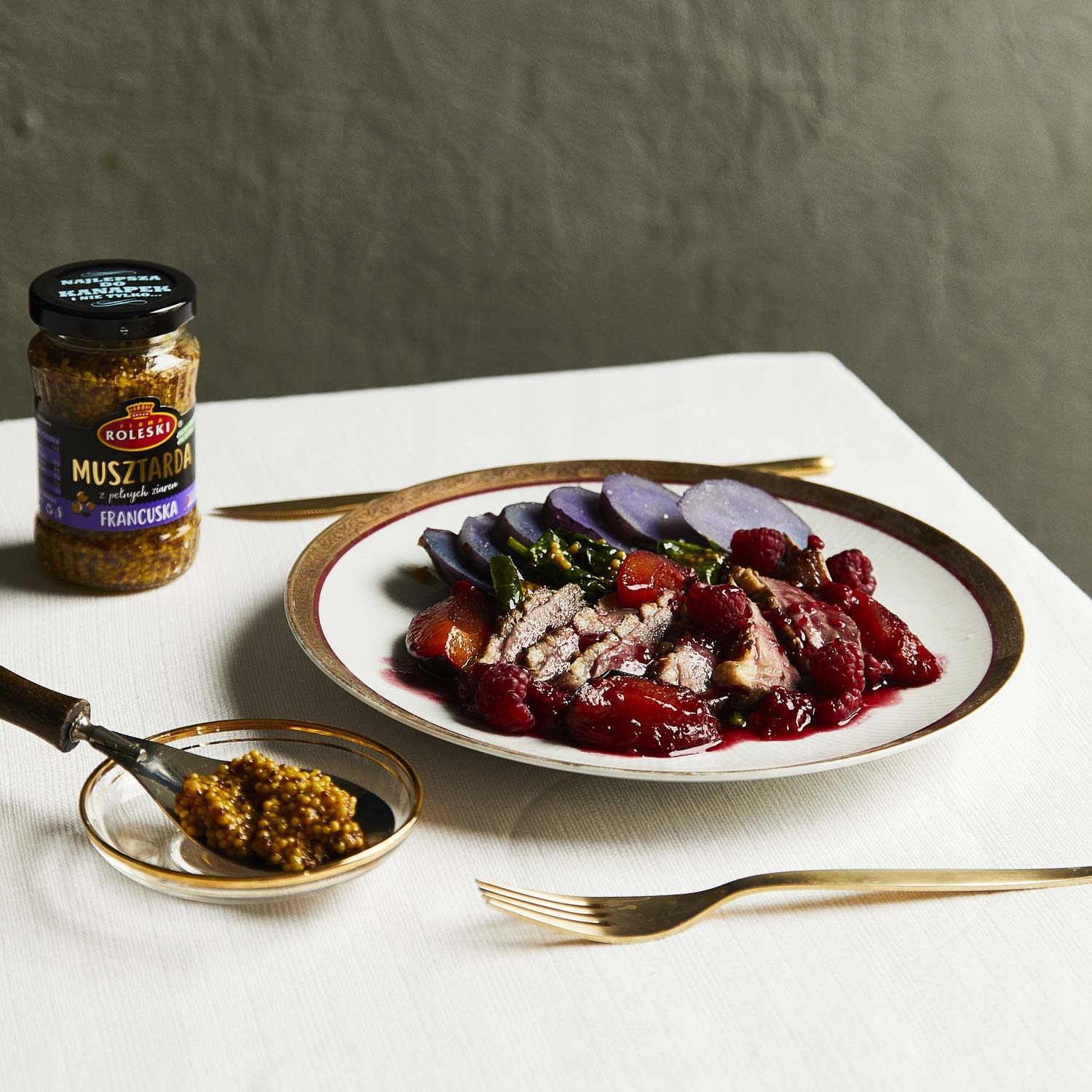 Утиная грудка со сливовым соусом, малиной и фиолетовым картофелем
