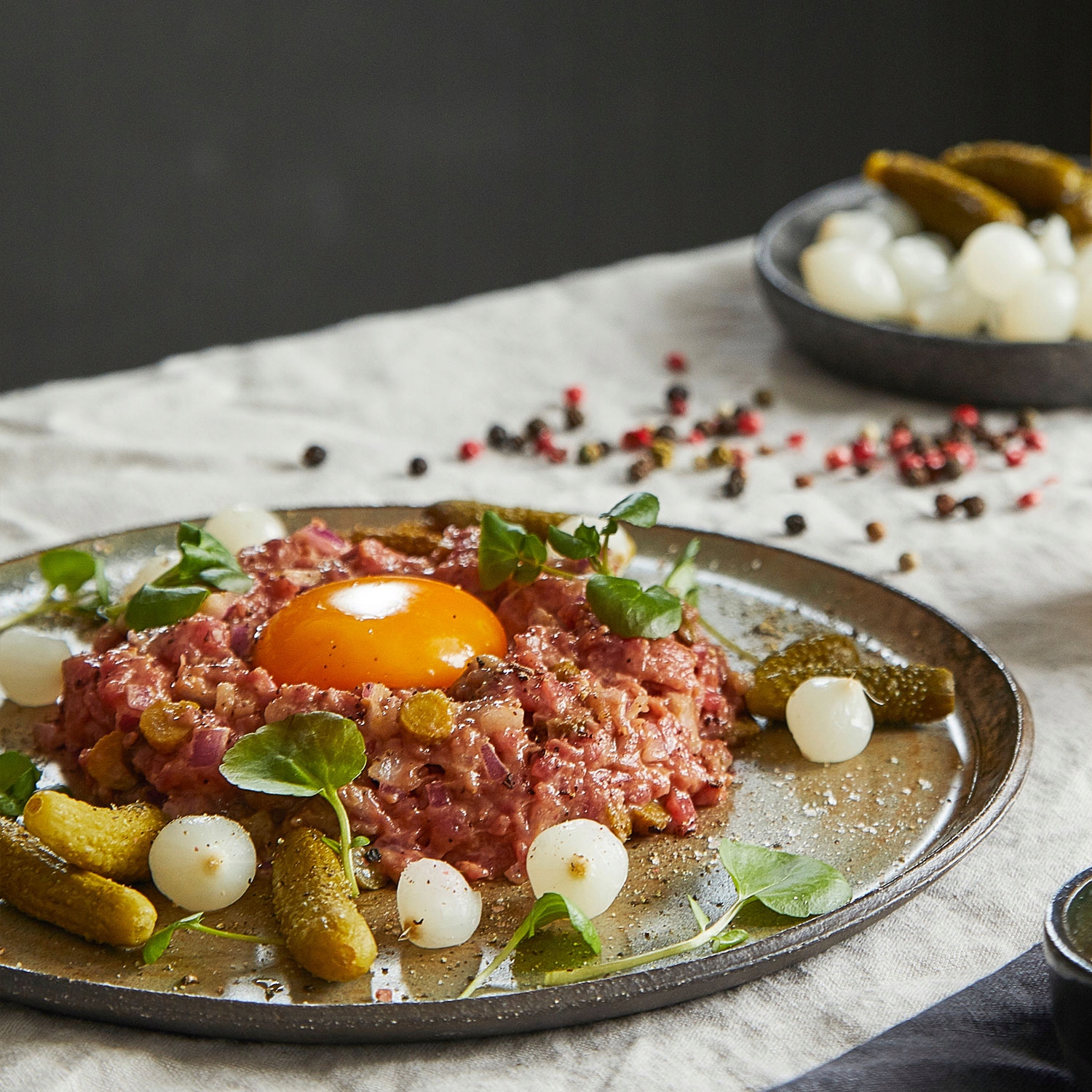 Тартар из рубленой вырезки с огурцами и маринованным луком