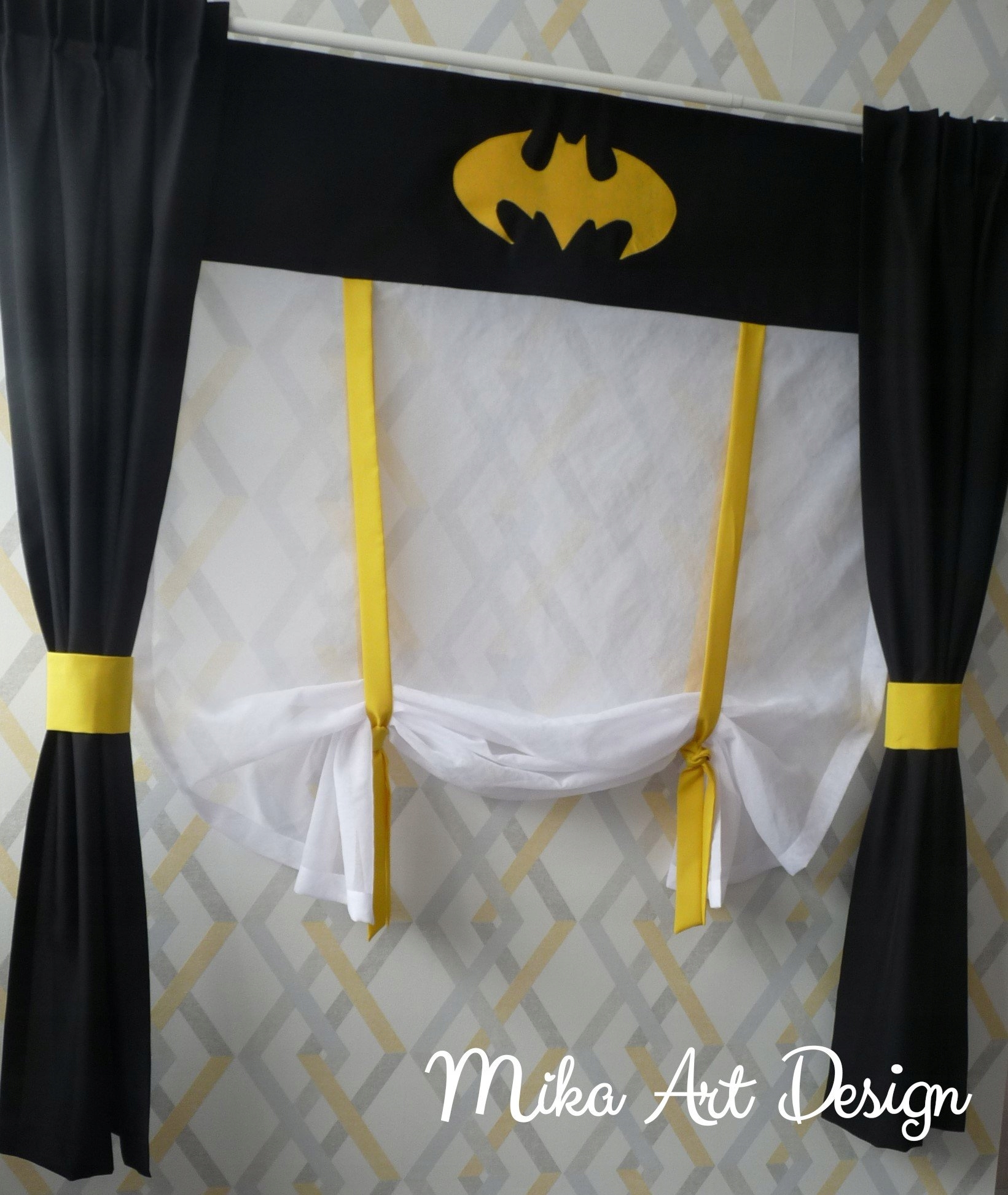 Панель, Штора – подвешивается на карниз. Материал верха - полиэстер - цвет - желтый, черный или с нашивкой логотипа БЭТМЕНА, низ - шерсть с вшитыми регулировочными завязками. Его можно завязать свободно или в рулоне.