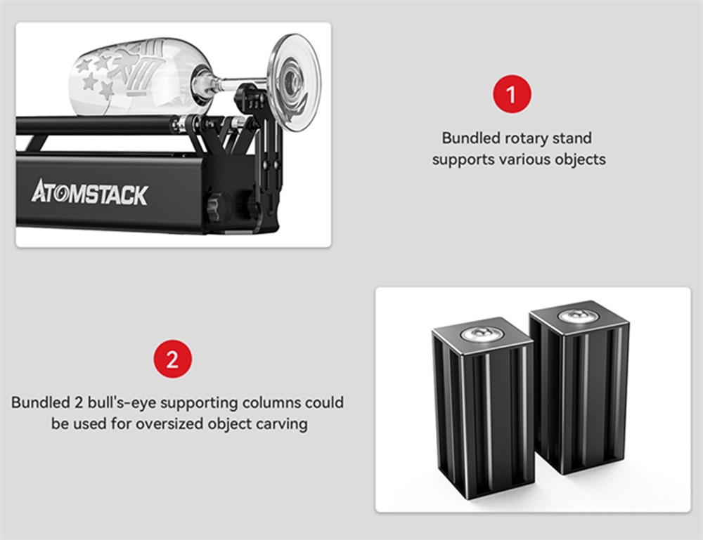 В поворотный ролик R3 Pro добавлено множество новых аксессуаров на базе R3. Это: 1 поворотный ролик (для зажима и вращения предметов); 4 опорные стойки (для установки и подъема гравировального станка); 2 х Опорные валы (для поддержки и крепления негабаритных предметов); 1 опорная рама (для стабилизации и защиты ножек чашки от опрокидывания). Короче говоря, серия R3 Pro имеет более полный набор аксессуаров.