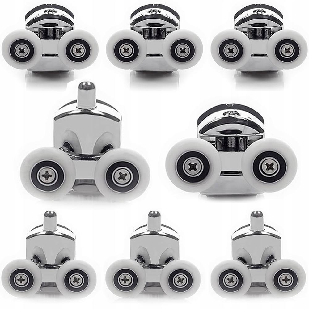 Набор двойных сменных роликов для душевых кабин. Диаметр подшипника в этих роликах составляет 25 мм. Держатели, крепящие ролики к стеклу, хромированные. Нижние ролики имеют кнопку, позволяющую снять стекло нажатием. Верхние ролики регулируются в пределах 13 мм. Все подшипники заменяемы благодаря крепежному винту подшипника.