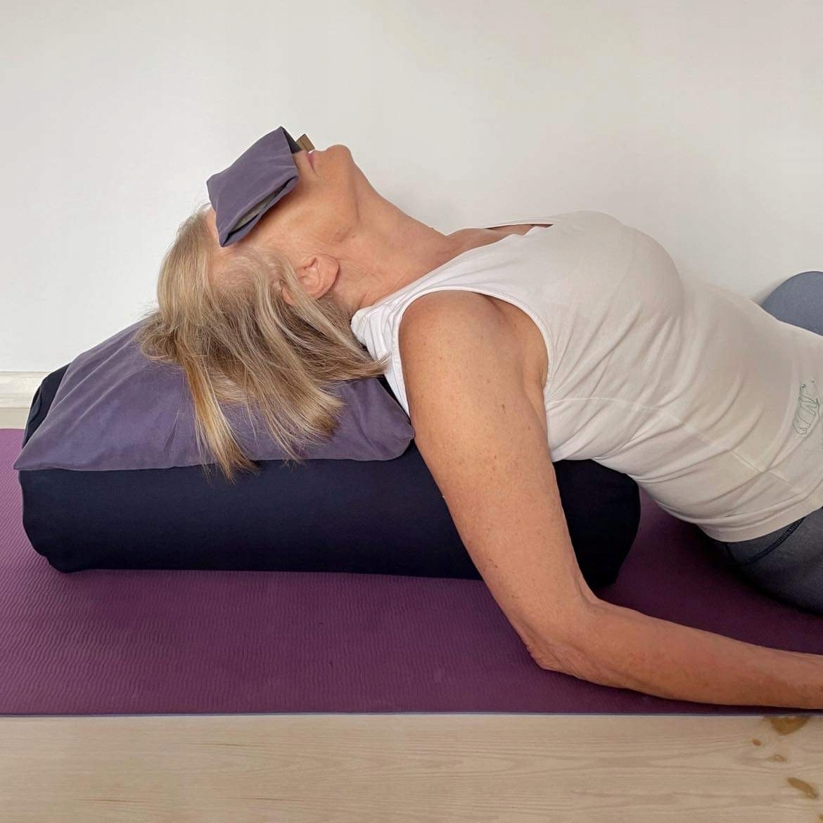 - supta-baddha-konasana -a захваченное угол, одно из самых любимых позиций "йоги". Это расслабляющая позиция, в которой мы лежим с согнутым оружием и объединены подошвы ног. В этом случае туловище поддерживается на валу вдоль позвоночника. Кроме того, ноги пойманы с ремнем, а под головой мы поместили универсальную подушку, цветущую ум.