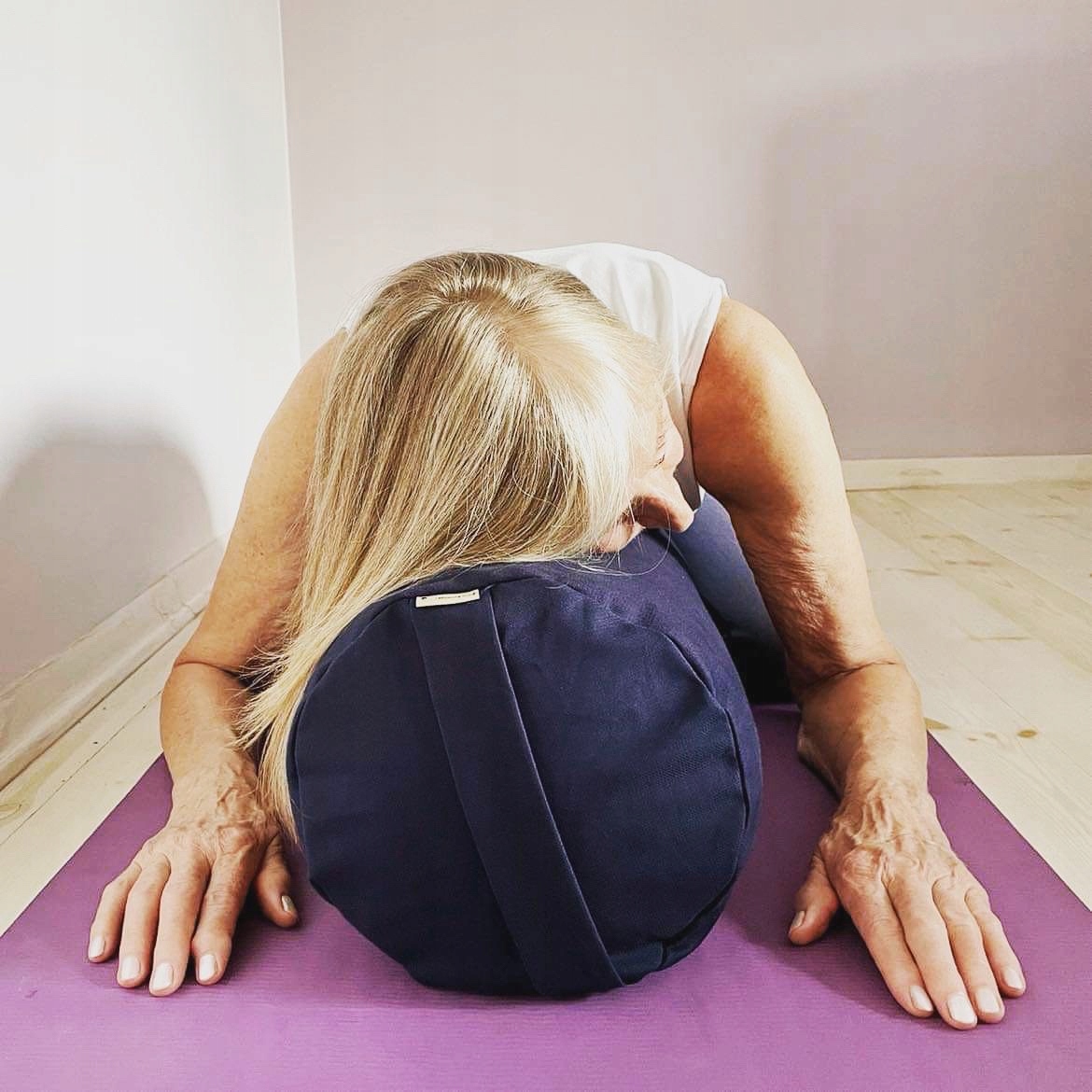 - maricasana iii - В этом случае мы используем ролик в качестве места, которое увеличивает наши бедра. Позиция принадлежит группе поворотов. Мы сидим на ролике, что помогает нам легче выпрямить и вытащить туловище. Сидя у стены, вы можете основывать руку на ней и, таким образом, скручивать.