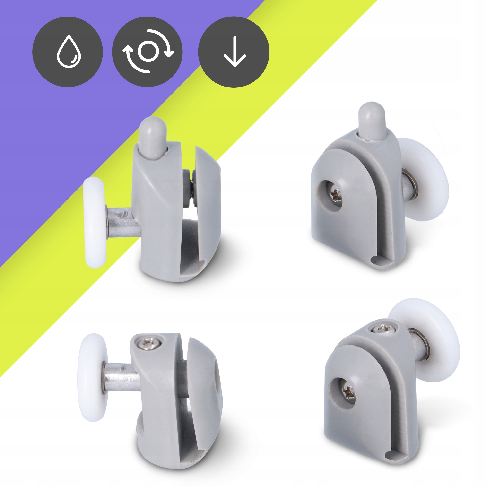 Верхние ролики оснащены регулируемыми креплениями, а нижние имеют съемную функцию - что существенно облегчает ежедневную уборку. Душ работает тихо, легко и надежно даже при интенсивном использовании.