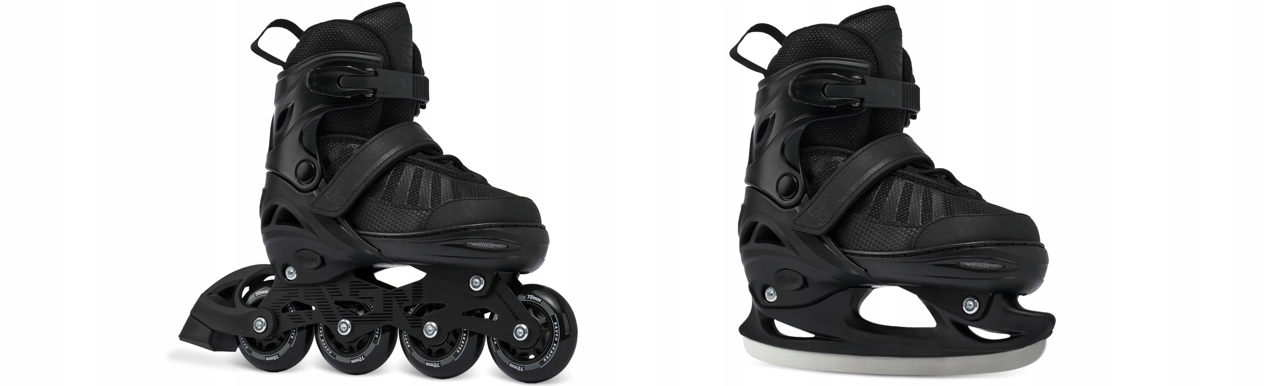 Модель 2-в-1 оснащена сменными полозьями, с помощью которых роликовые коньки можно быстро и легко превратить в коньки.