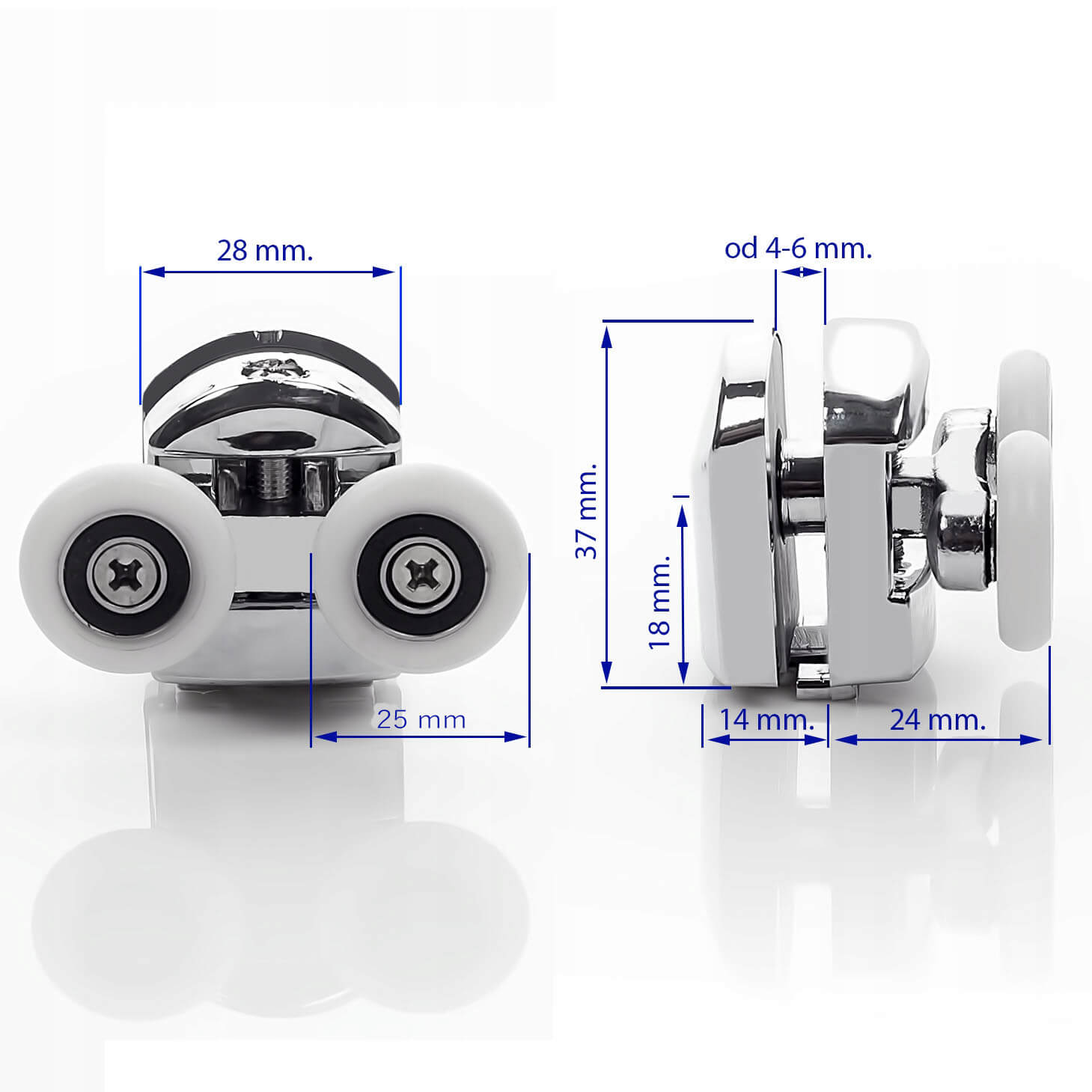 Набор двойных сменных роликов для душевых кабин. Диаметр подшипника в этих роликах составляет 25 мм. Держатели, крепящие ролики к стеклу, хромированные. Нижние ролики имеют кнопку, позволяющую снять стекло нажатием. Верхние ролики регулируются в диапазоне 13 мм. Все подшипники заменяемы благодаря крепежному винту подшипника.
