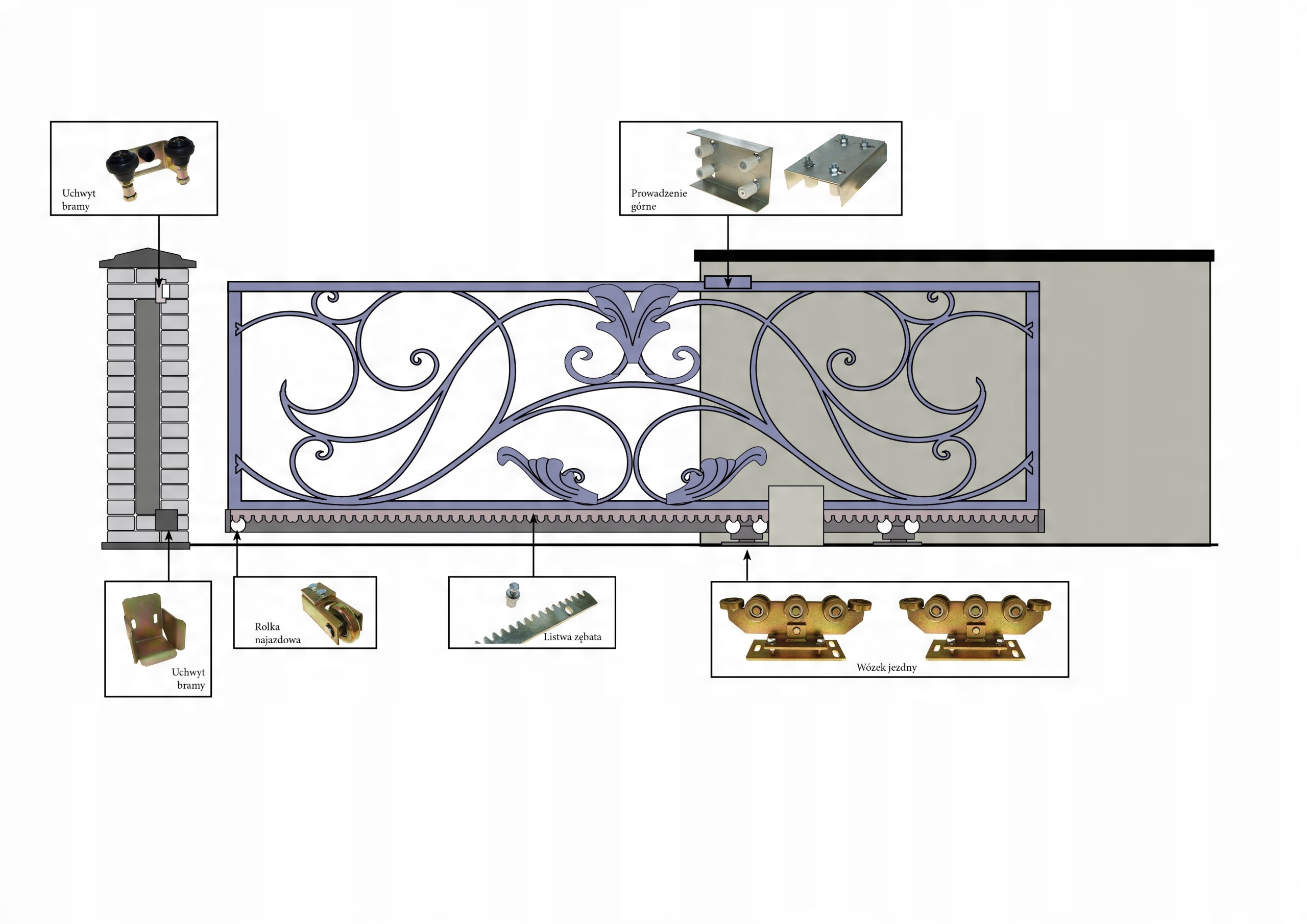 комплект с необходимой фурнитурой для откатных ворот, предназначенных для направляющей 80х80х5 мм p>