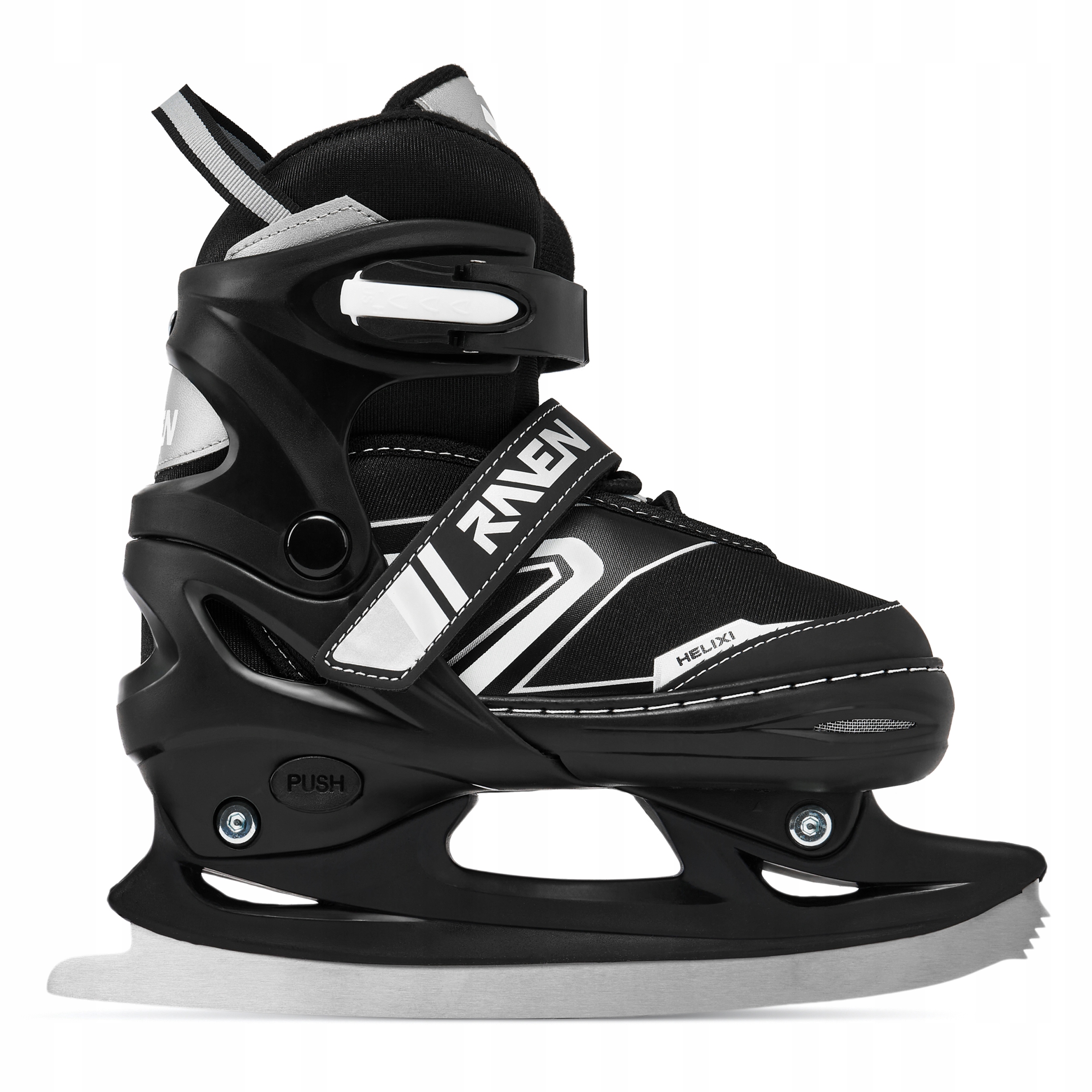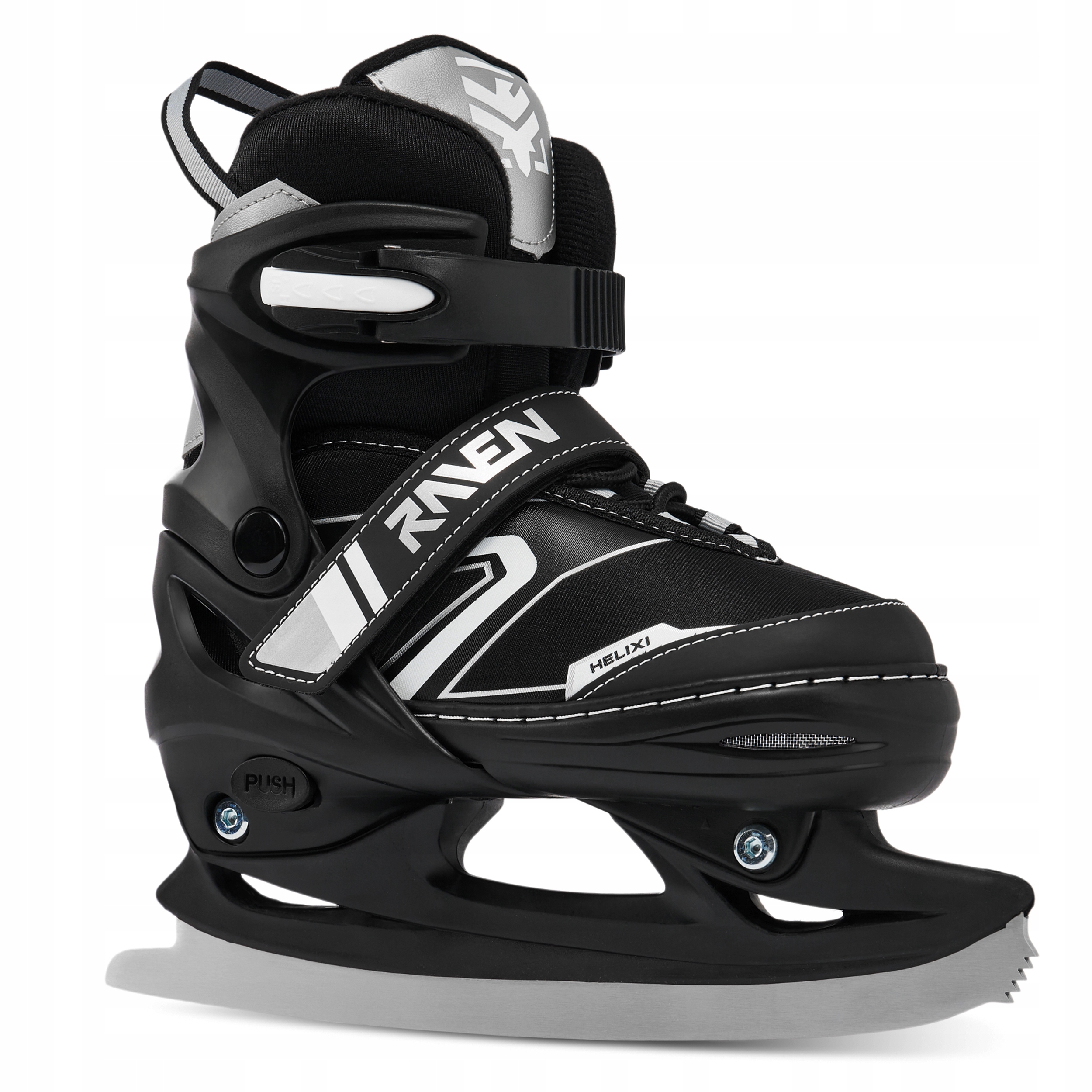 Шнурки, пряжка с зубчатым ремнем и защелка обеспечивают правильное затягивание и надежное удержание ноги в обуви, предотвращают смещение стопы и гарантируют безопасное вождение. Застежки на коньках Raven имеют кнопку, которая предотвращает их расстегивание во время катания. Ремешок на липучке позволяет удерживать шнурки, предотвращая их случайное расстегивание.