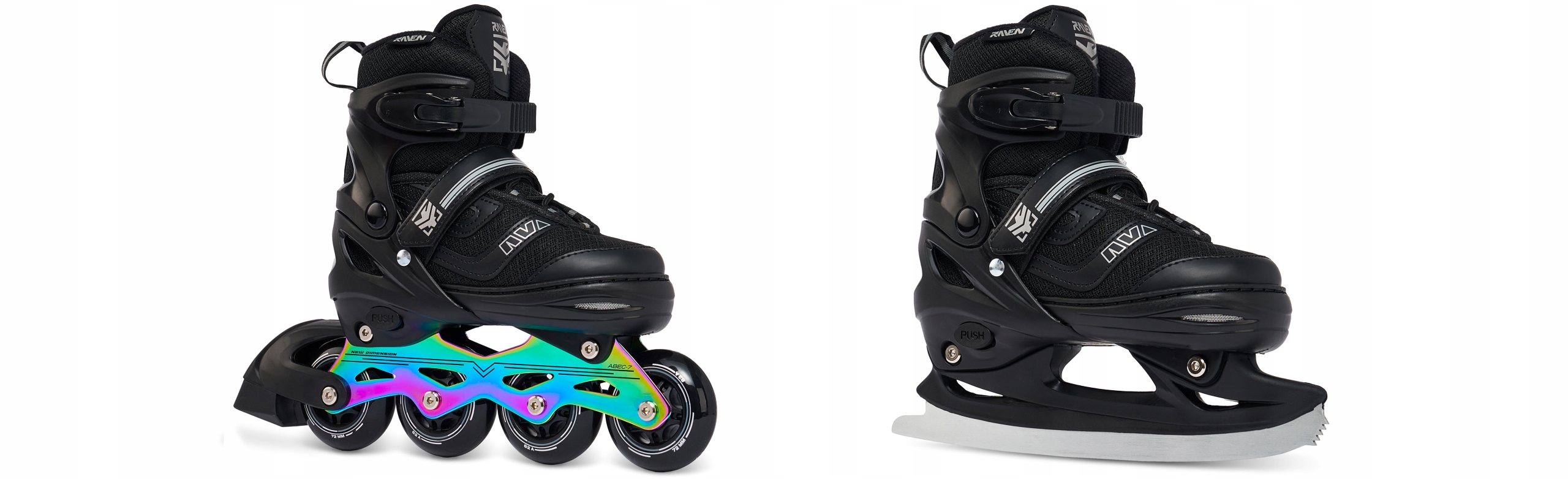 Модель 2-в-1 оснащена сменными полозьями, с помощью которых роликовые коньки можно быстро и легко превратить в коньки.