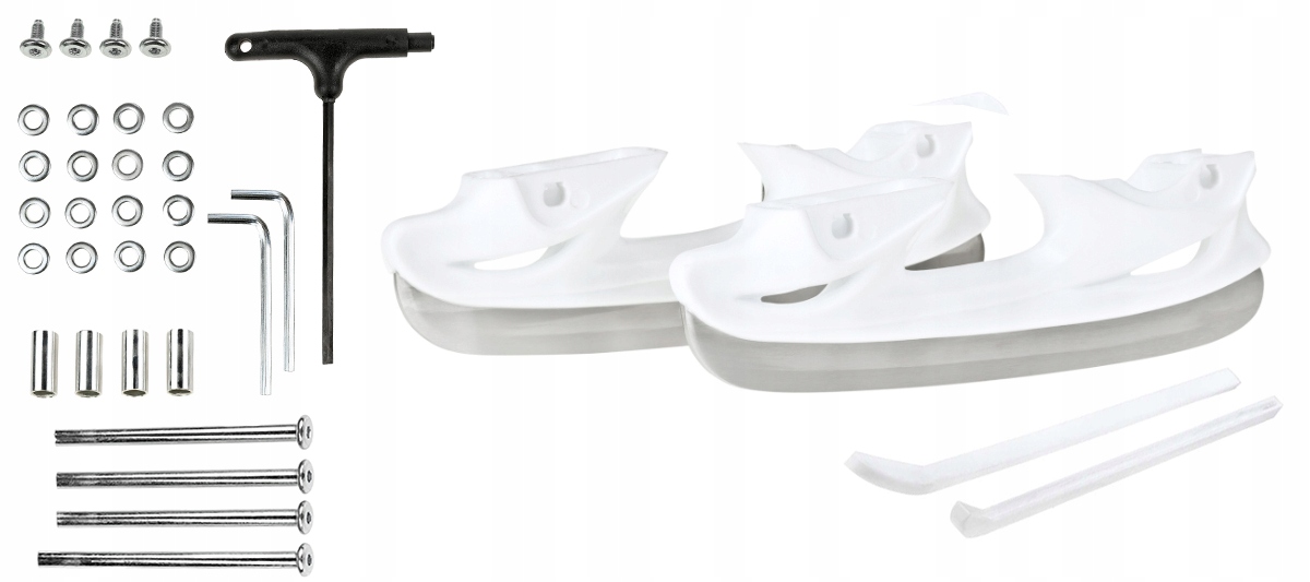 Гаечные ключи, винты и удлиненные оси, позволяющие открутить колеса и установить их с обеих сторон роликовых полозьев для получения нужной конфигурации. Это облегчает первые шаги на роликах, помогает сохранять равновесие и снижает вероятность падения.