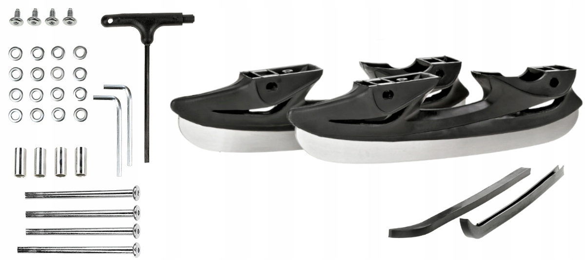 Гаечные ключи, винты и удлиненные оси, позволяющие открутить колеса и установить их с обеих сторон роликовых полозьев для получения нужной конфигурации. Это облегчает первые шаги на роликах, помогает сохранять равновесие и снижает вероятность падения.