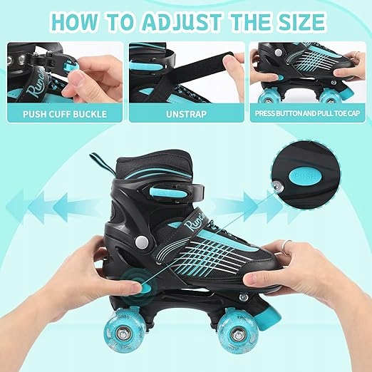 ➡️ Регулируемые размеры: роликовые коньки Runcinds можно легко отрегулировать до четырех разных размеров, что делает их идеальными для быстро растущих детей.