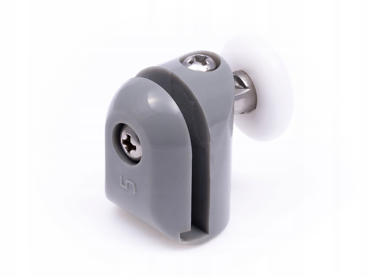 Верхние ролики для душевой кабины на одном подшипнике диаметром 25 мм. Положение ролика регулируется с помощью винта, поднимающего или опускающего штифт, на котором установлено колесо. Шпиндель подвижный, поэтому данная модель катка подойдет и в случае с полукруглыми кабинками. Условием крепления ролика является отверстие диаметром 10-12 мм, центр которого находится на расстоянии 19 мм от края стекла. Верхний ролик марки Sannit подходит для стекла толщиной 4-6 мм. Материал, из которого изготовлен корпус конька – ABS – материал повышенной прочности.