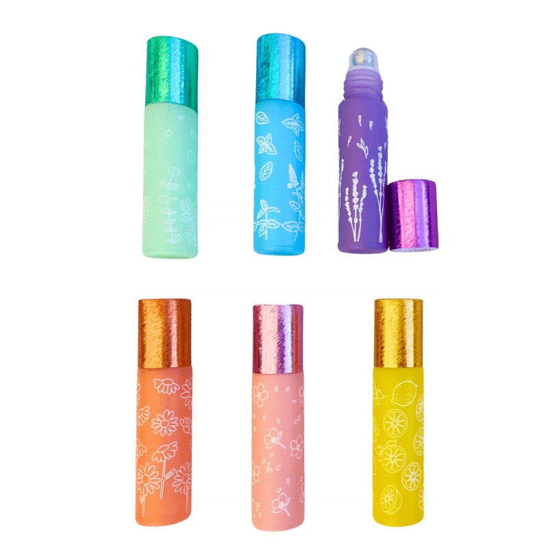 Роликовый флакон с растительным принтом, матовое стекло. 6 разноцветных бутылочек по 10 мл.