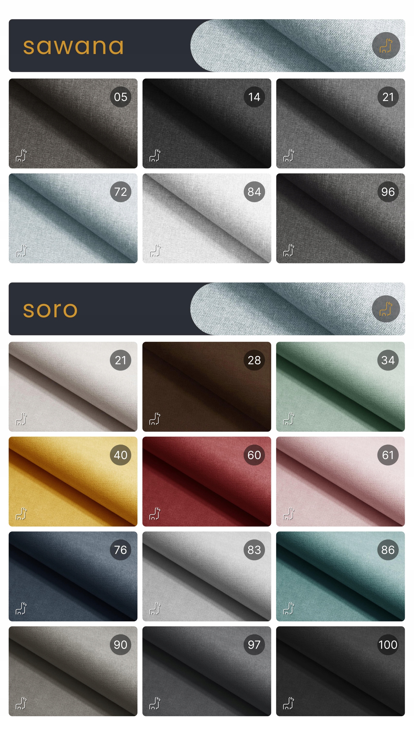 Ткань Соро – бархатная ткань. Эта ткань мягкая на ощупь и струящаяся, но не эластичная. Он также достиг высокого результата в тесте Мартиндейла — целых 100 000 циклов. Это означает, что он устойчив к трению и не образует дыр после нескольких лет использования. Ткани с таким результатом относят к материалам коммунального назначения, например, к автобусам. Он способен выдерживать высокую частоту использования.