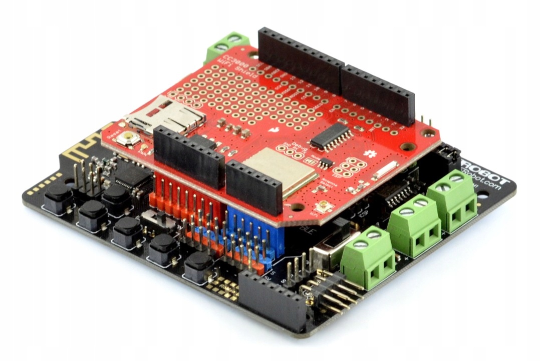 модуль Dfrobot, совместимый с Arduino uno. В дополнение к традиционным функциям этого типа плитки, он имеет модуль Bluetooth, двухканальный контроллер двигателя 32V/2A, выключатель питания и множество дополнительных розеток и выходов